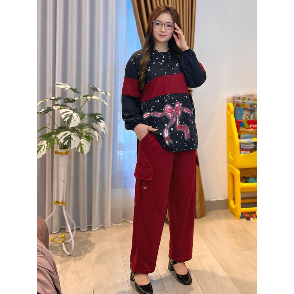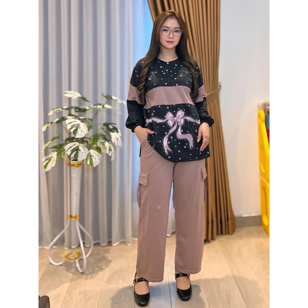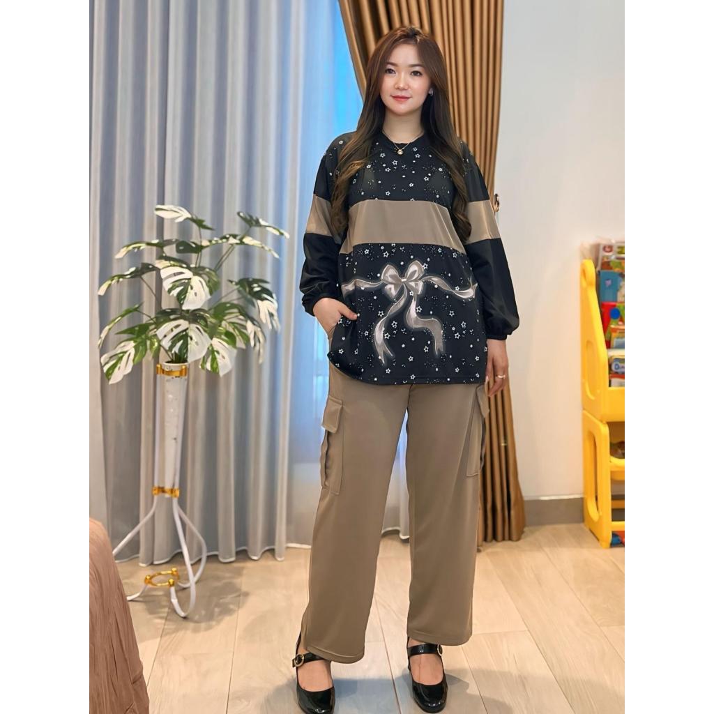 Setelan Cargo Lengan Panjang Oversize Terbaru LD 120 CM Setelan Wanita Atasan Lengan Karet dan Celana Cargo Fashion Muslim SR5632