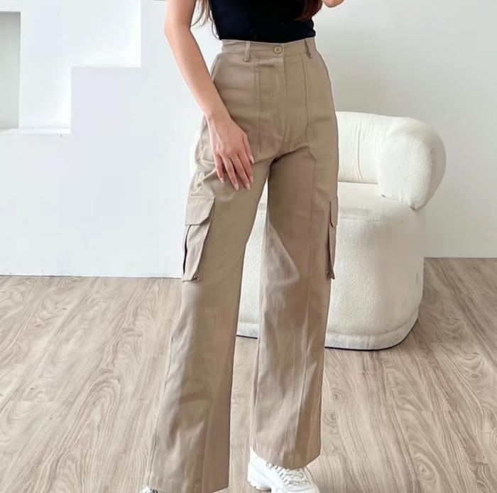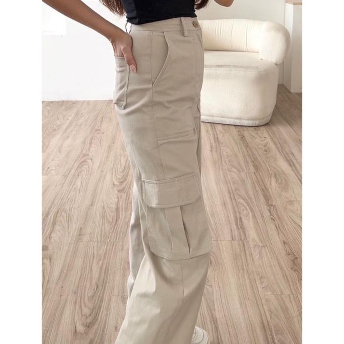 Zayida - Rora Cargo Pants - Celana Kargo Wanita Katun Twill Stretch Melar Highwaist Loose Korean Style Jumbo - Cream, S