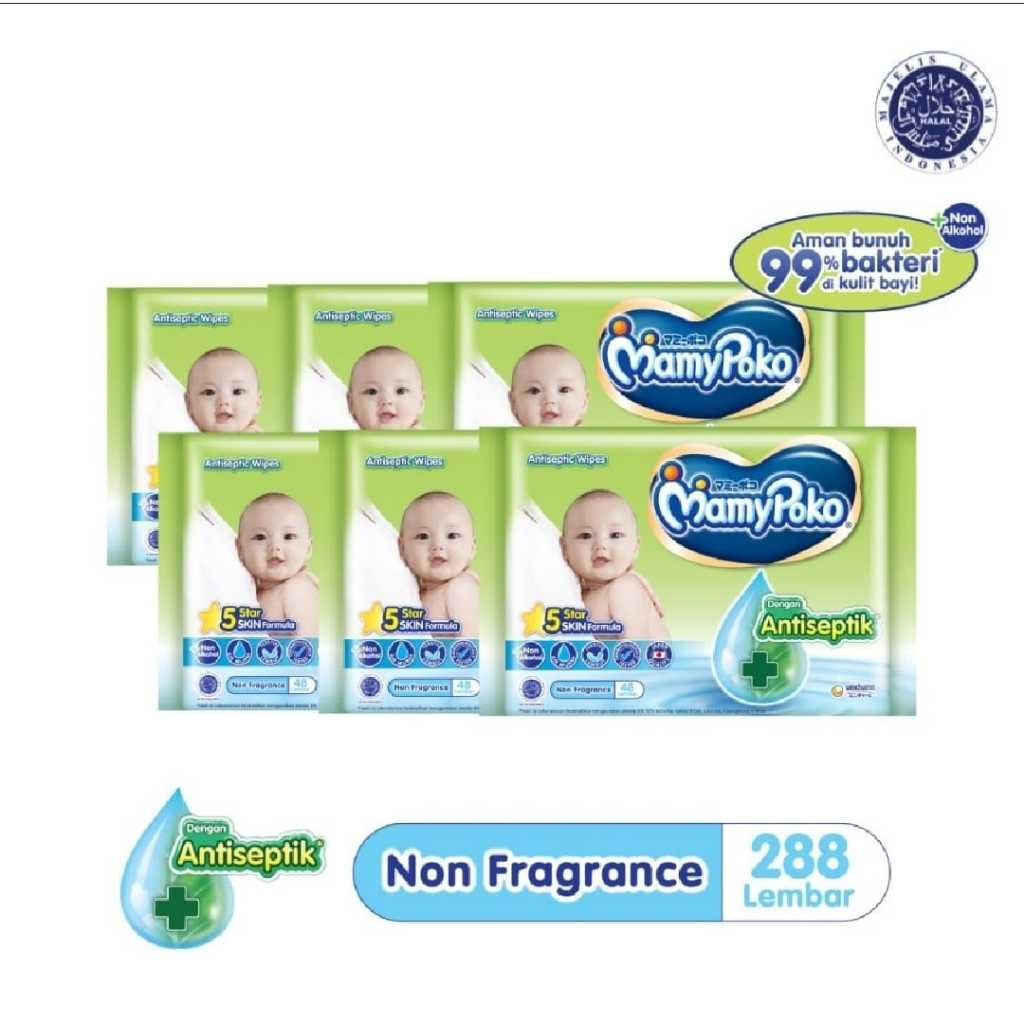 Tisu basah mamy poko air murni, 6 pack X 50 s non fragrance, baby powder, hand & mouth kan dus