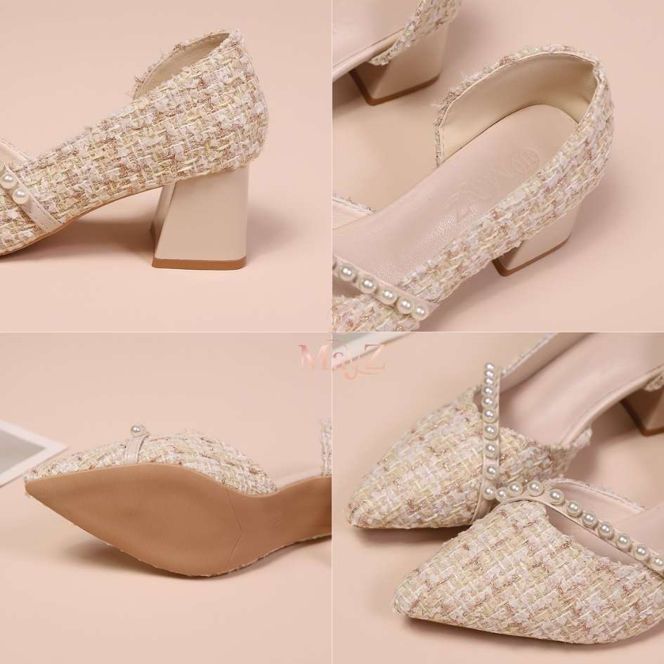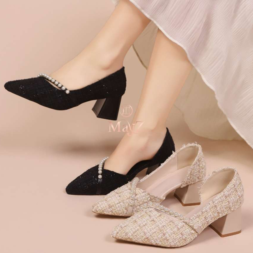 MAYZ Aleena Heels Pesta Wanita Sepatu Pearl Tweed Heels Hak Tahu Elegan Slip On [ 223 ]