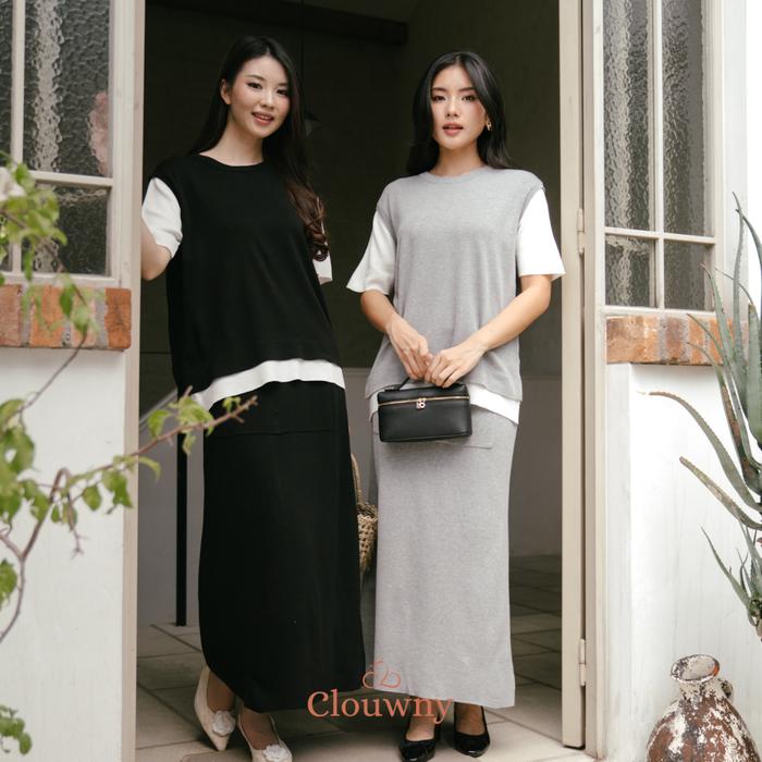 Clouwny Virna Combi Knit Set Setelan Rok Wanita Premium Knit Fit To Xxl Korean Look - Black