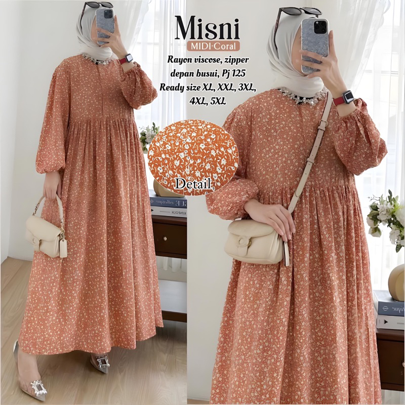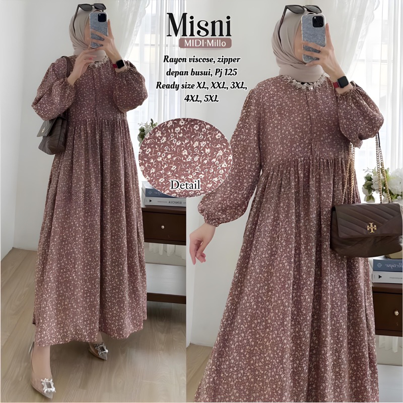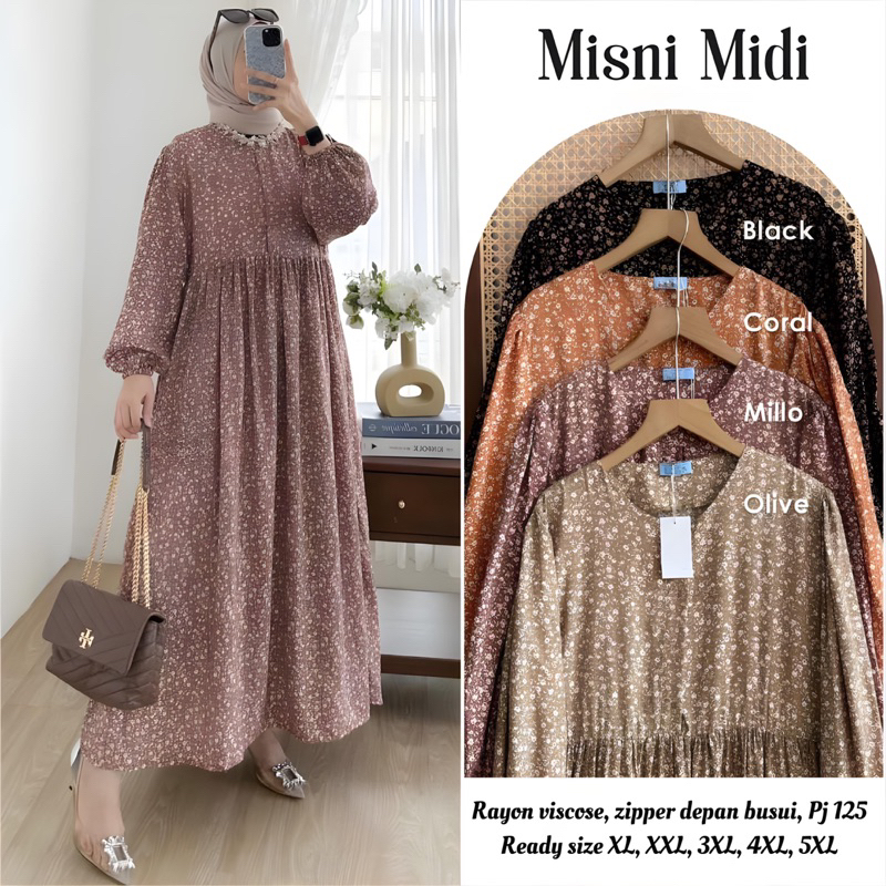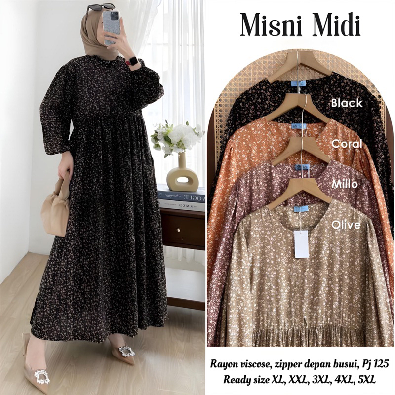 MISNI MIDI Dress Big Size Gamis Lebaran LD 150 140 130 120 110 Panjang 125 Super Jumbo XL XXL 3XL 4XL 5XL Rayon Viscose Motif Bunga Polka Zipper Busui
