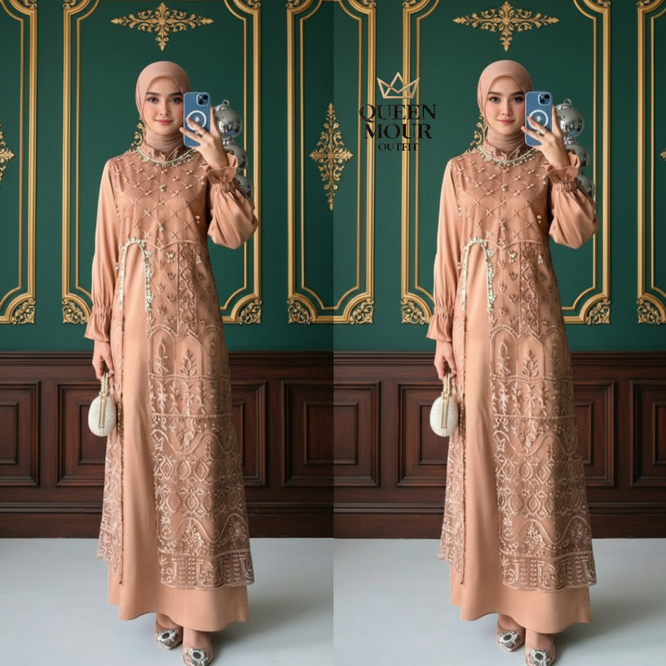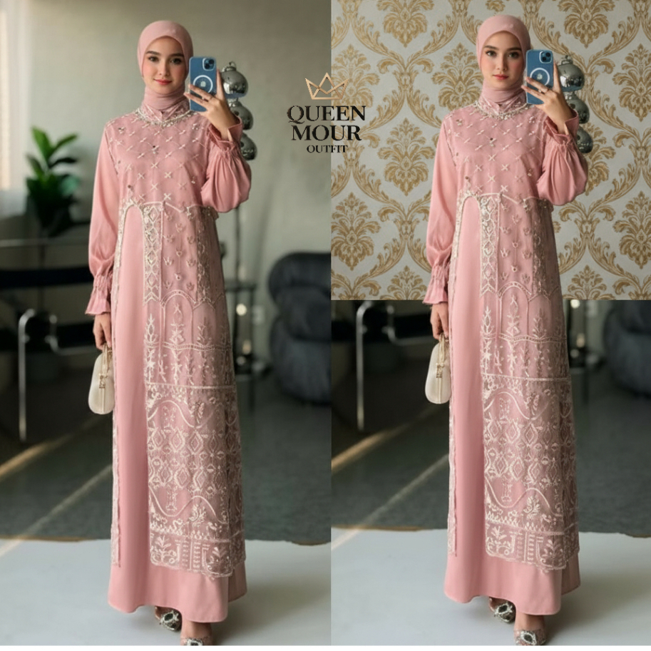 Marsya Dress Silk Burgandy Set Outer Brukat Aplikasi Payet Mutiara Gamis Pesta Wanita Kekinian OOTD