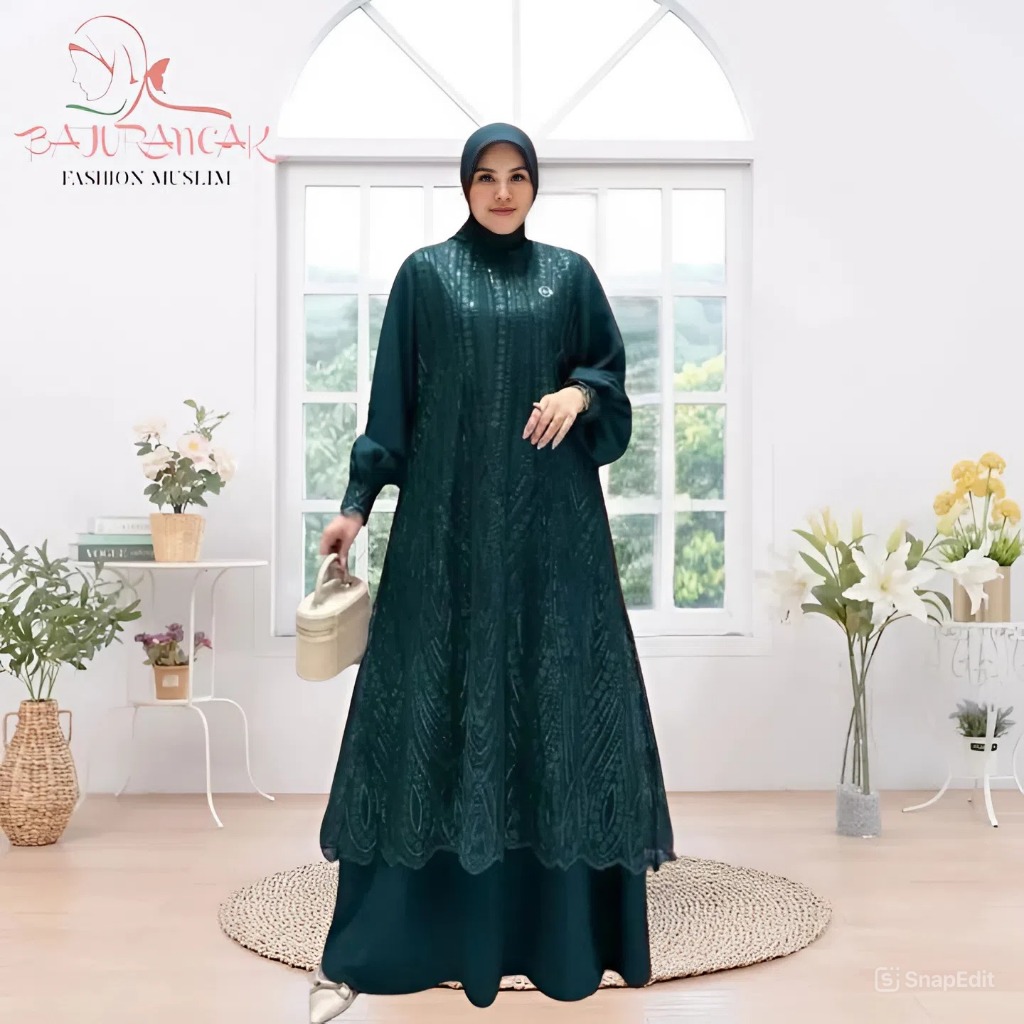 Lunarra Lace Baju Gamis Raya Wanita Muslimah Bahan Ceruty Babydoll Mix Brokat Mewah Elegan Pesta