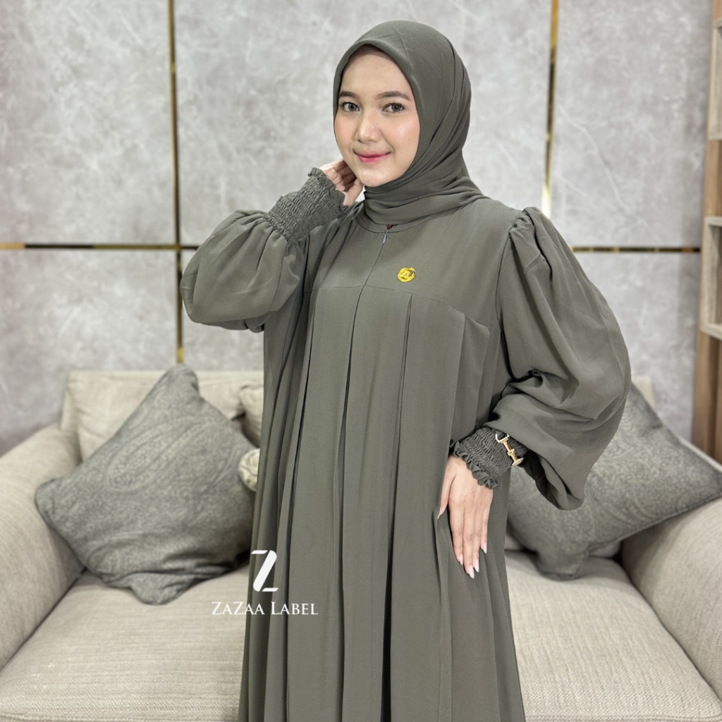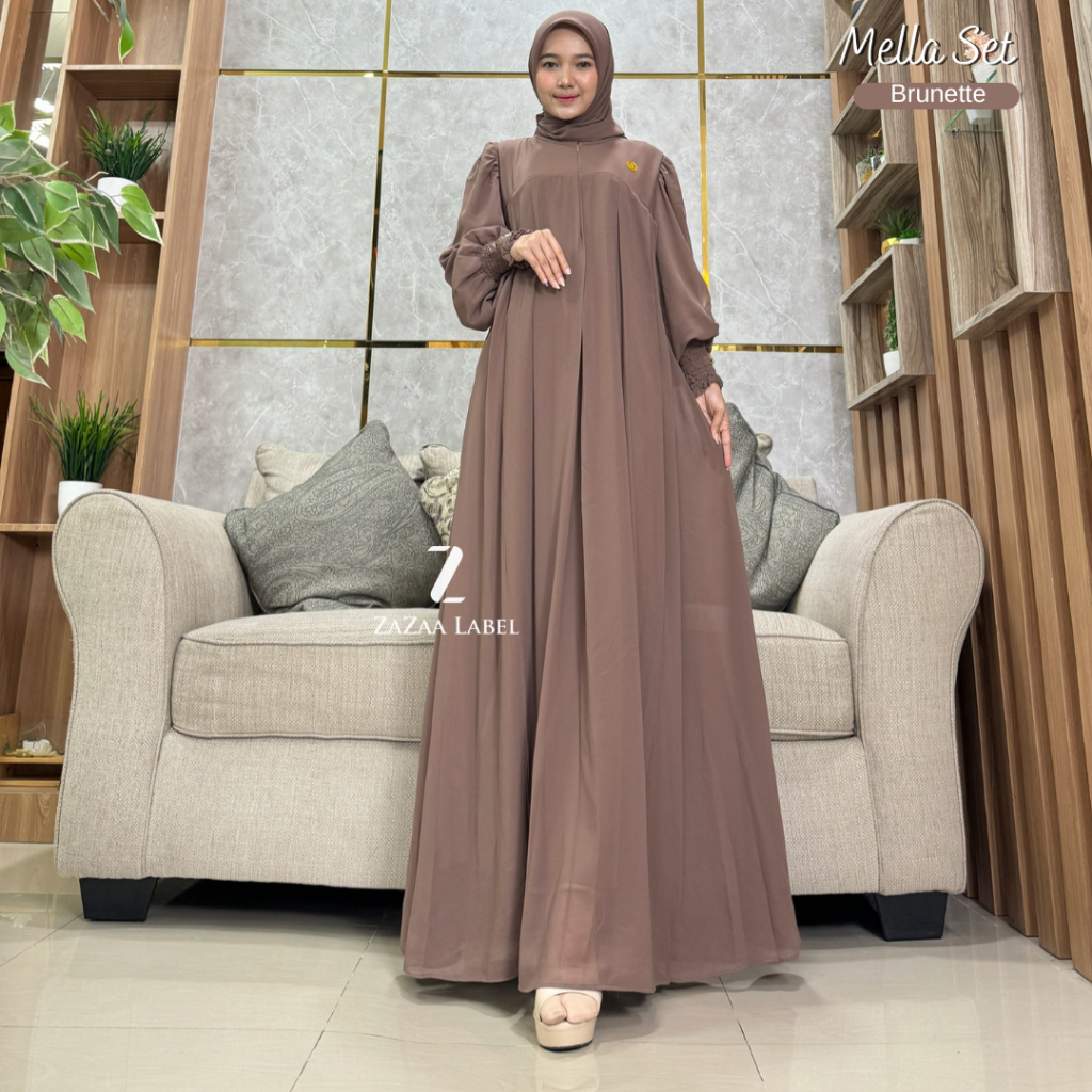 Zazaa Label New Mella Set Gamis Hijab Motif Polos Bahan ceruti babydoll Busui Pesta Mewah
