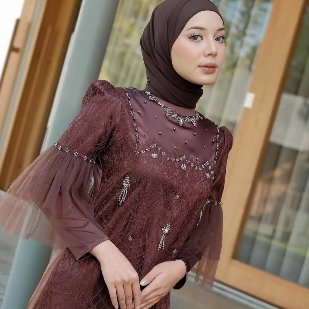 Rinjani Dress Matt Silk Roberto Mix Brukat Cantily Aplikasi Payet Mutiara Gamis Pesta Warna Mahogany