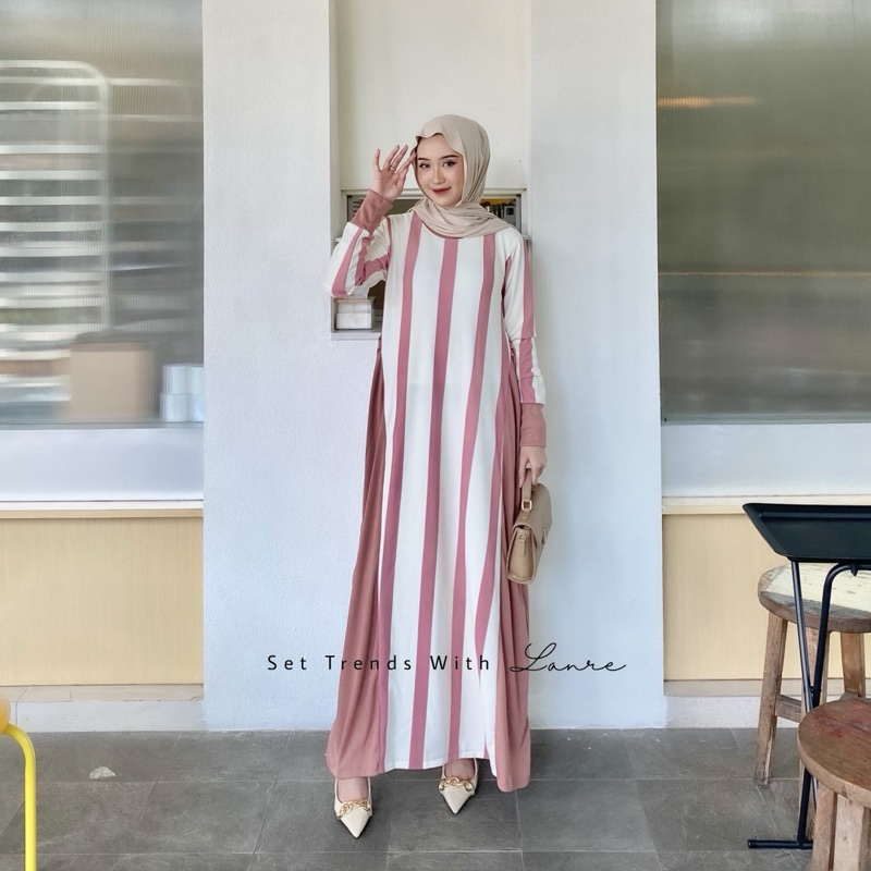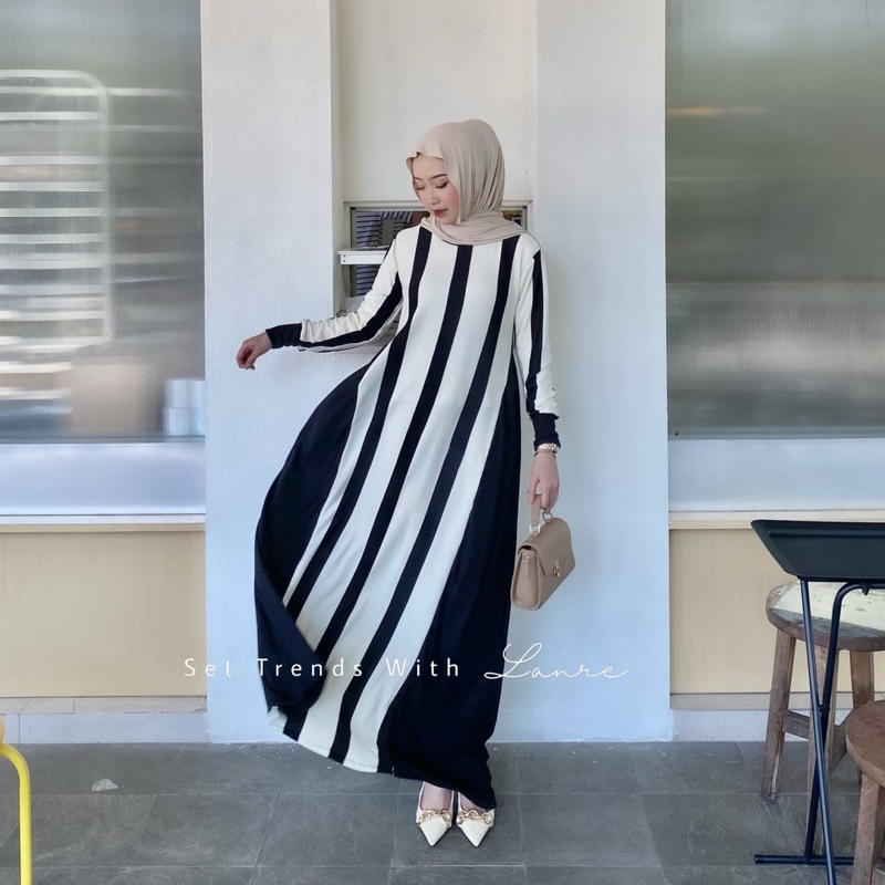 Vina Dress Salur Garis Elegan Bahan Knit Gamis Cantik Wanita Muslimah