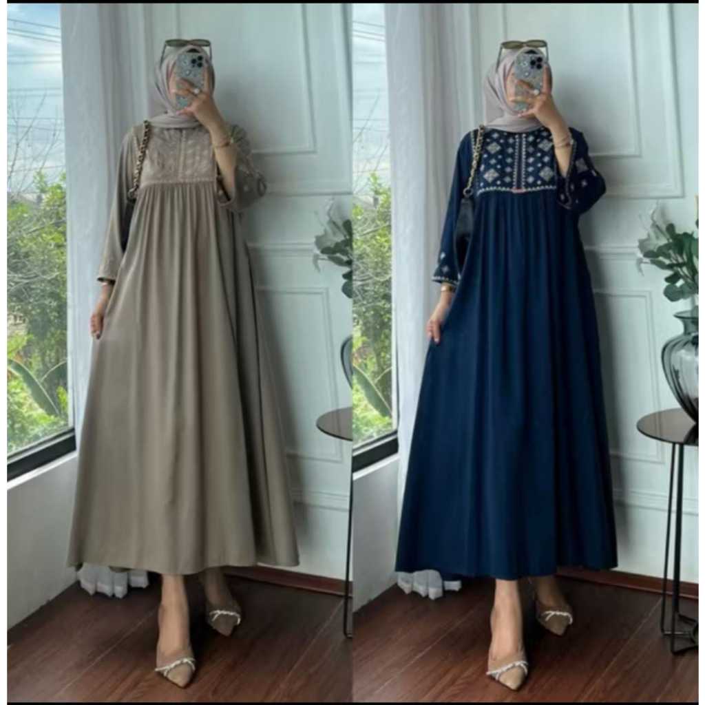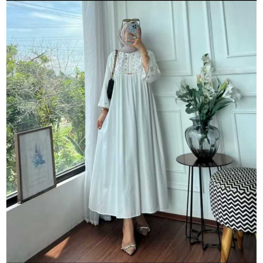 Dina Midi Dress Rayon Premium Polos Lengan 34 Motif Bordir Bumil Busui Wanita Kekinian Original