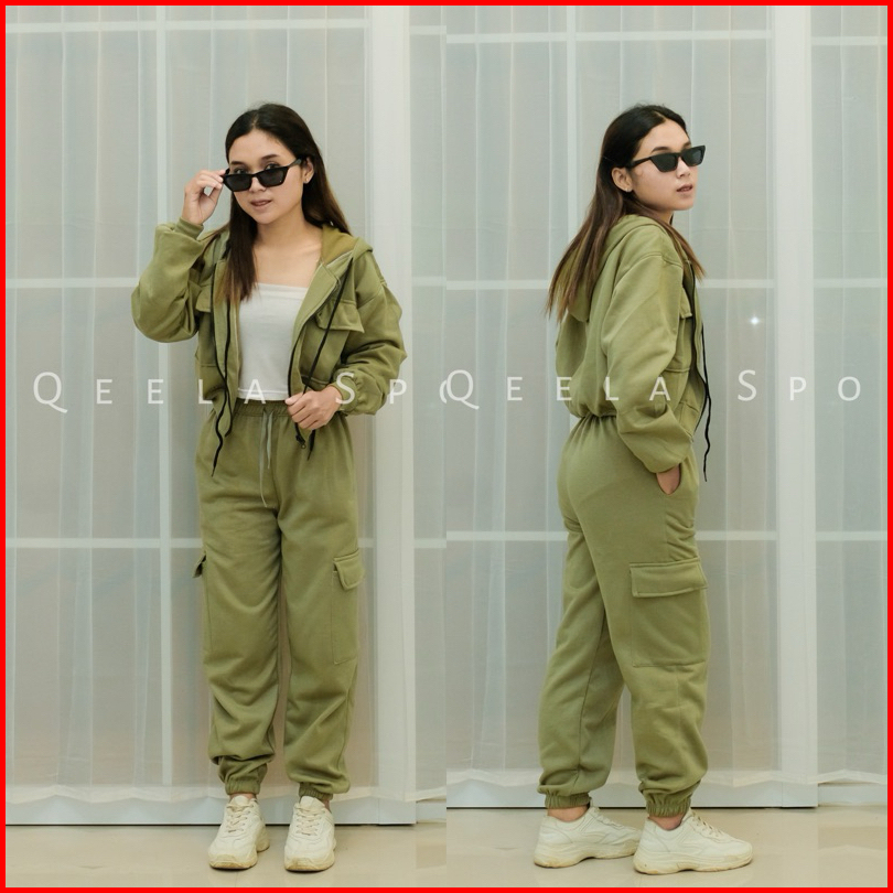 Setelan Crop One Set Wanita Hoodie Zipper X Jogger Cargo Sweatpants Oneset Ootd Korean Style Viral