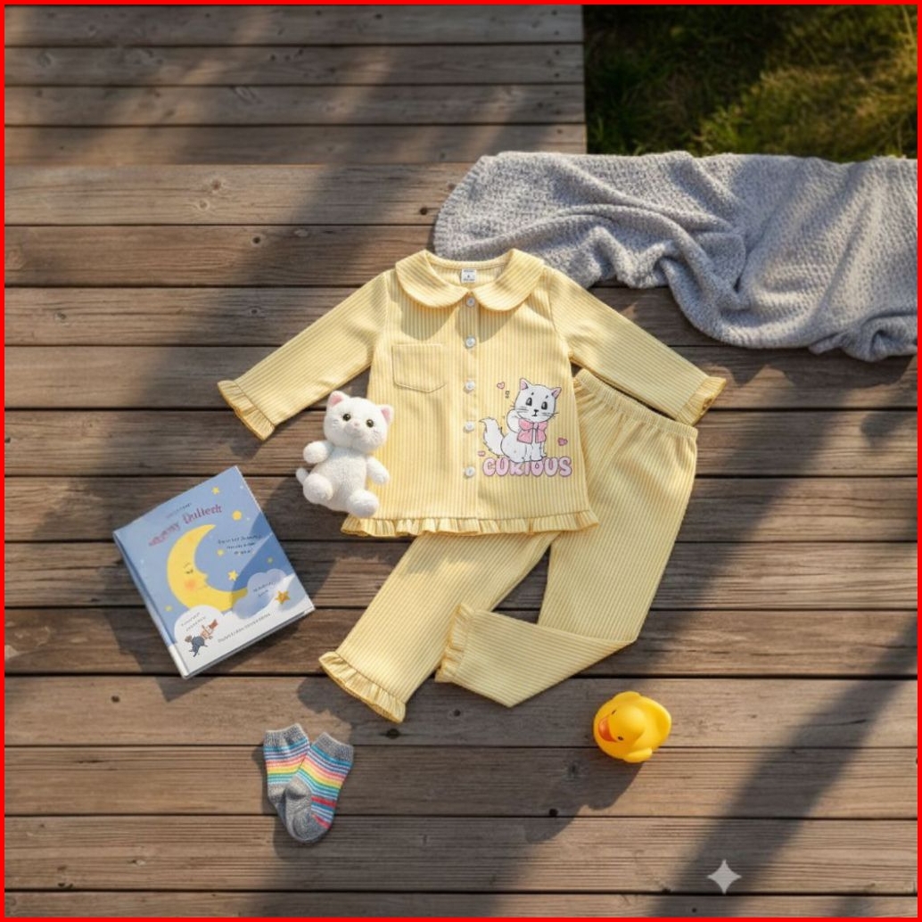 Set Piyama Anak Perempuan 1-8 Tahun Motif Kucing Garis Baju Tidur Lengan Panjang Katun Lembut Nyaman Dipakai