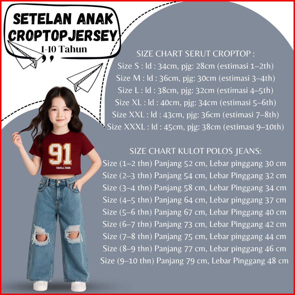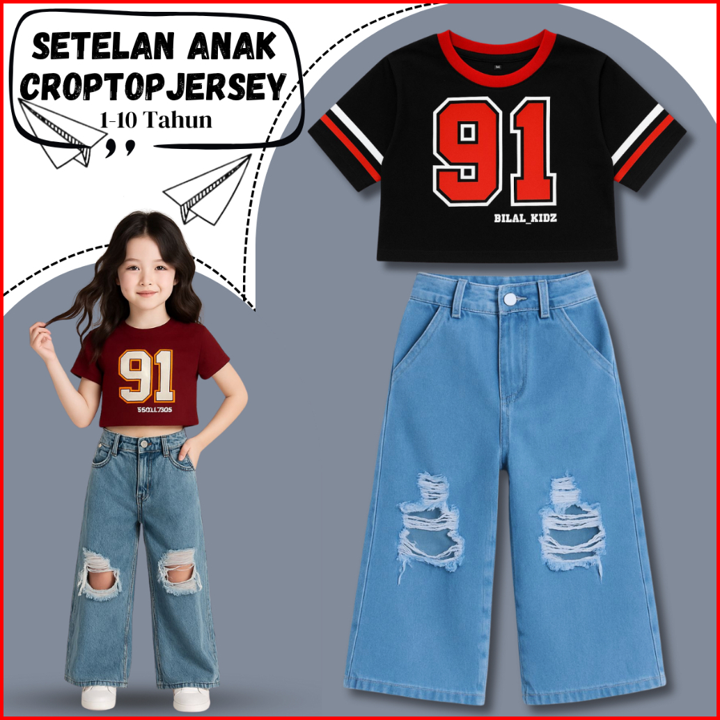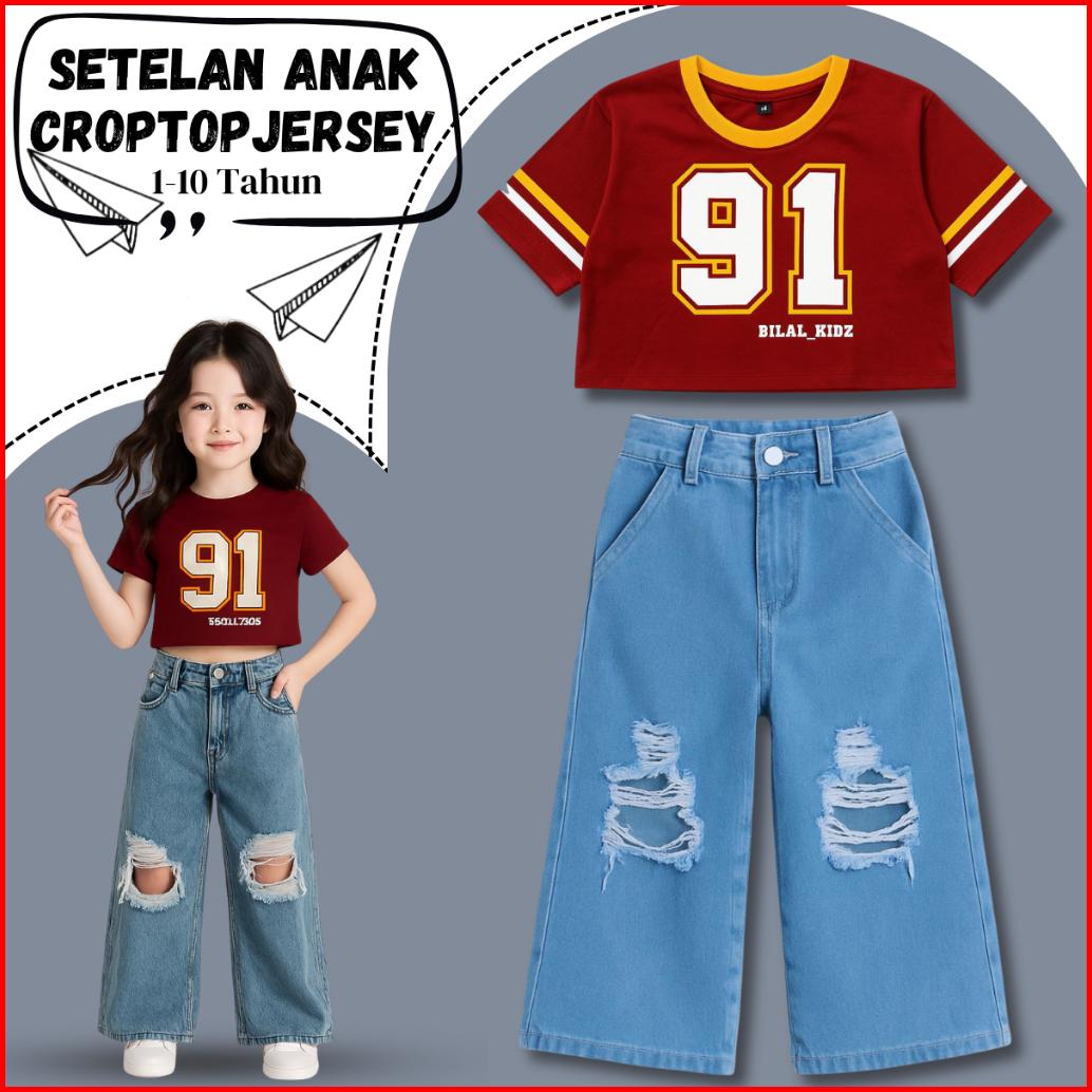 Setelan Anak Kulot Denim Sobek Korea Dan Kaos Jersey Anak Cewe Kekinian 1-10 Tahun