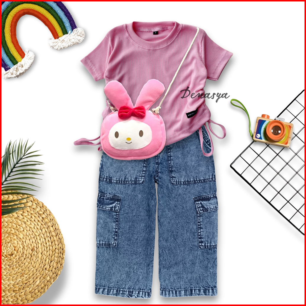 Pakaian Anak Perempuan Kekinian Setelan Baju Knit Dan Kulot Cargo Jeans Snowblue 1-12 Tahun