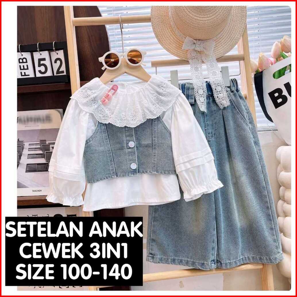 Loli-jkt Bs 826 Setelan Anak Cewek 3in1 Blouse Rompi Kancing Celana Jeans Size 100-140