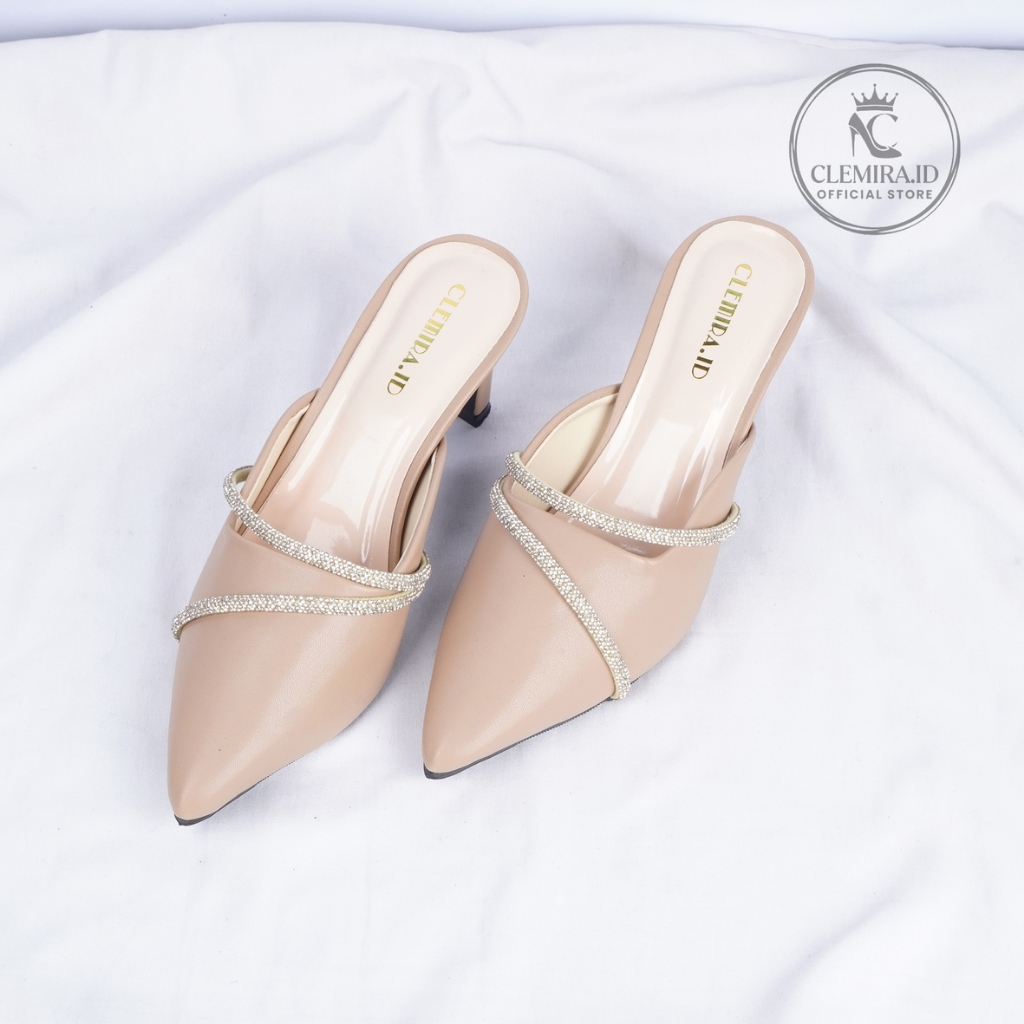 Clemira Sandal Heels Wanita Elegan Mules Pointed Toe Tali Kristal Hak 5 cm Empuk Premium