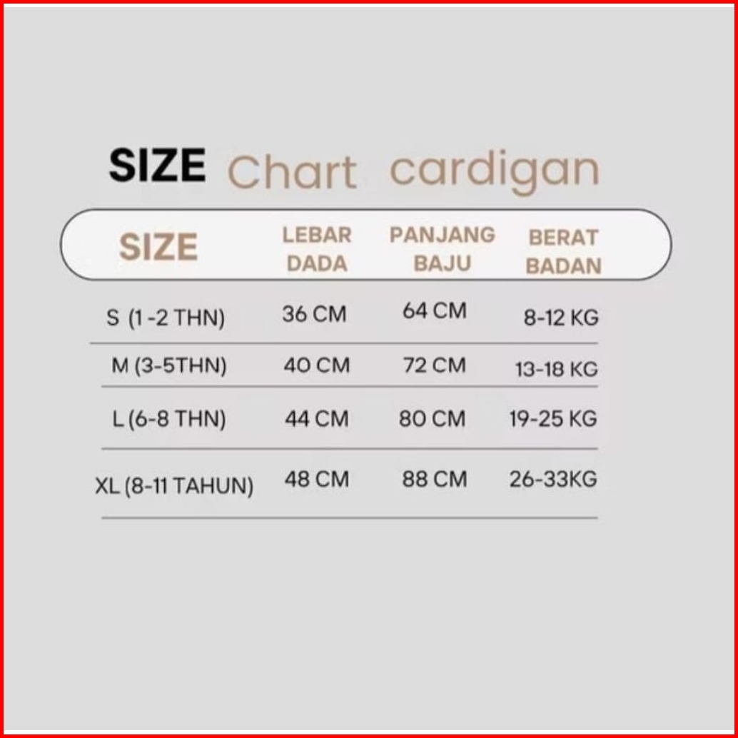 S.(1-2 tahun), M.(3-5 tahun), L.(6-8 tahun), XL.(9-12 tahun)