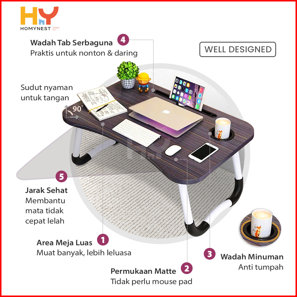 Homynest Meja Belajar Lipat Laptop Portable Ukuran 60 X 40 Cm Bahan Kayu Berkualitas