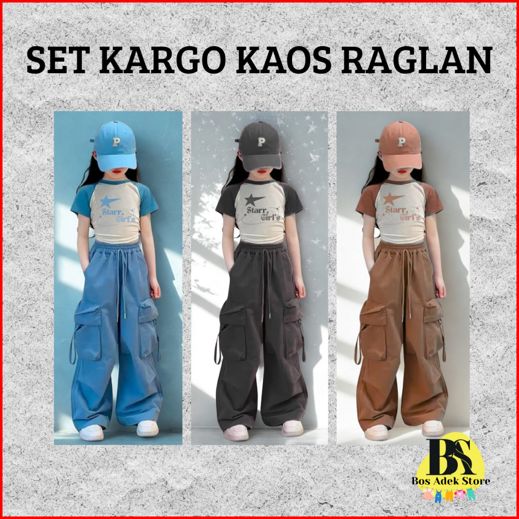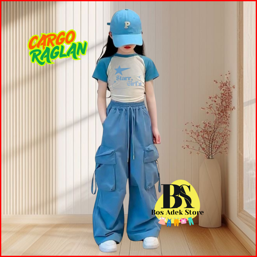 Setelan Cargo Kaos Raglan Motif Star Girl Fashion Anak Cewek Keren Trendy Kekinian Usia 1-10 Tahun