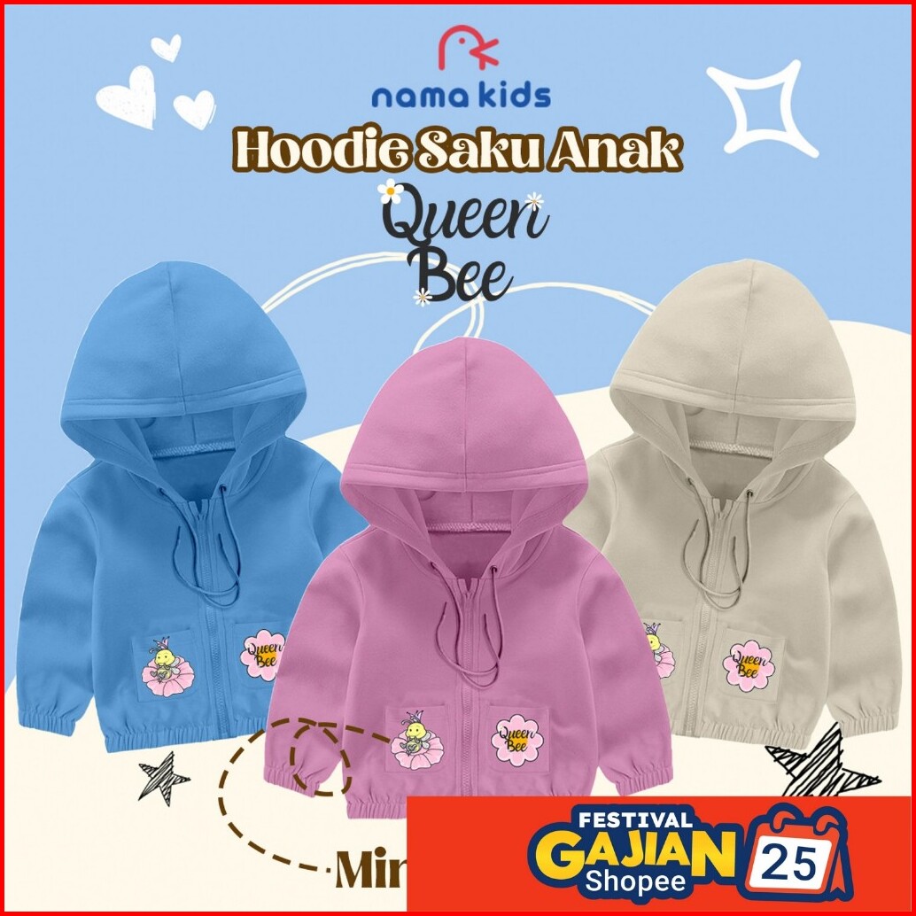 Sweater Anak Zipper Risleting Sablon Queen Bee Lucu Sweater Hoodie Anak Mini Pocket Saku Sablon Murah