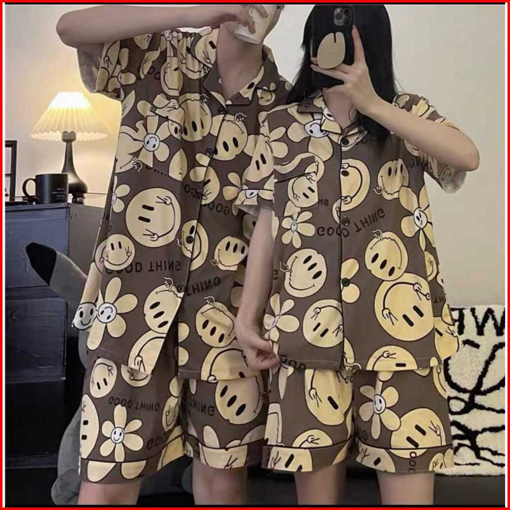 Rulif Baju Tidur Wanita Pria Couple Pendek Hotpant Stelan Krah Kancing Lengan Pendek Dbear 5553