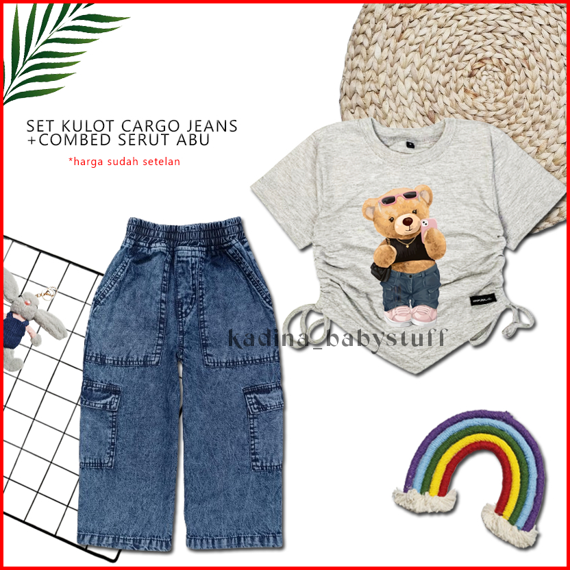 Setelan Anak Perempuan Kekinian Kulot Cargo Jeans Snow Wash Combed Serut Motif Sablon Terbaru 2-12 Tahun