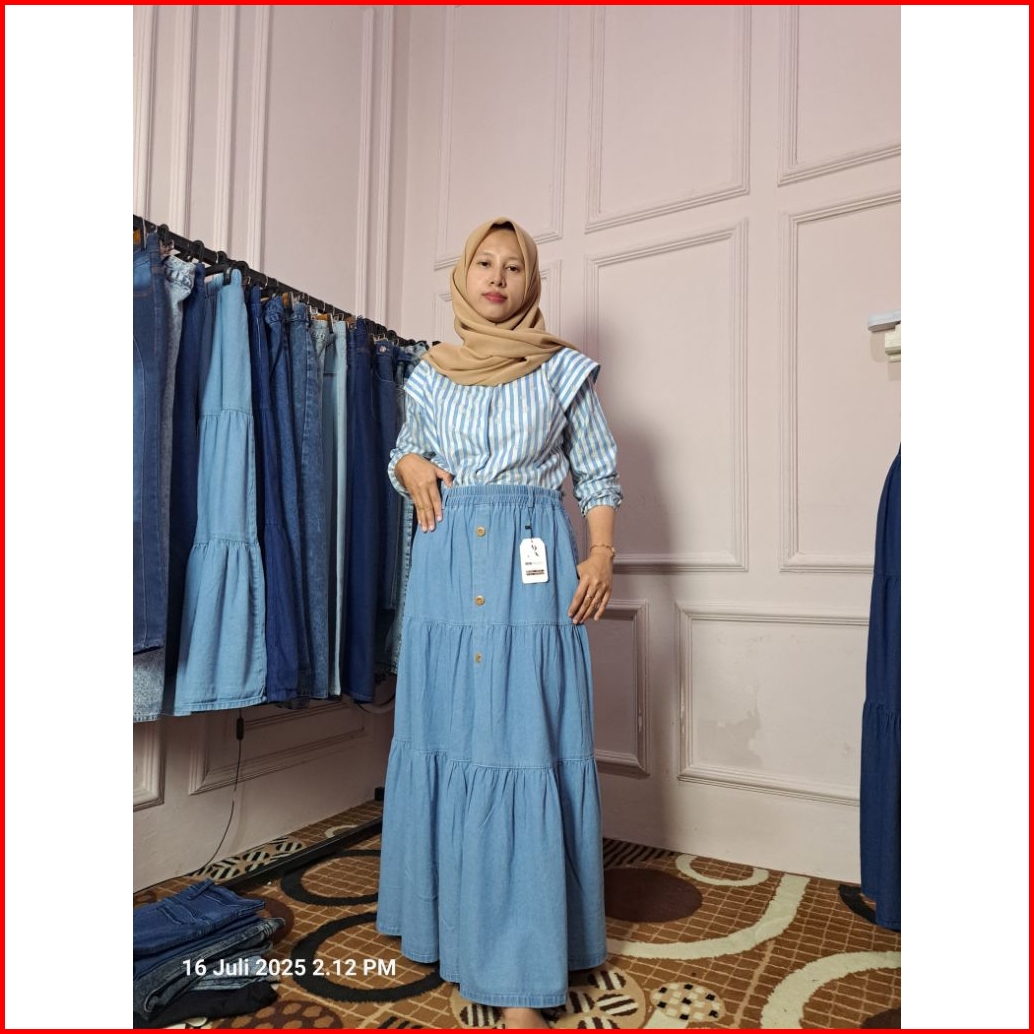 Ruffle Kancing A-line Rok Jeans Skirt Wanita Panjang Tebal Nyaman