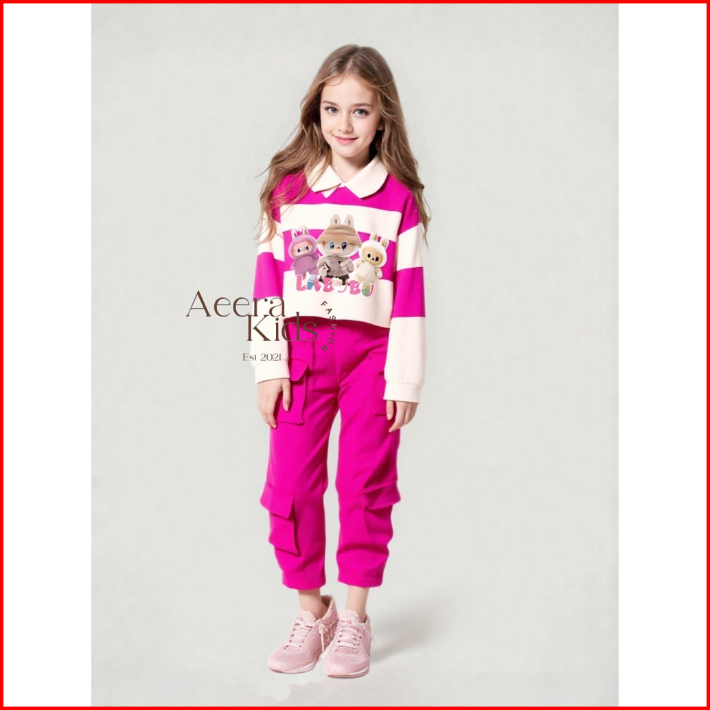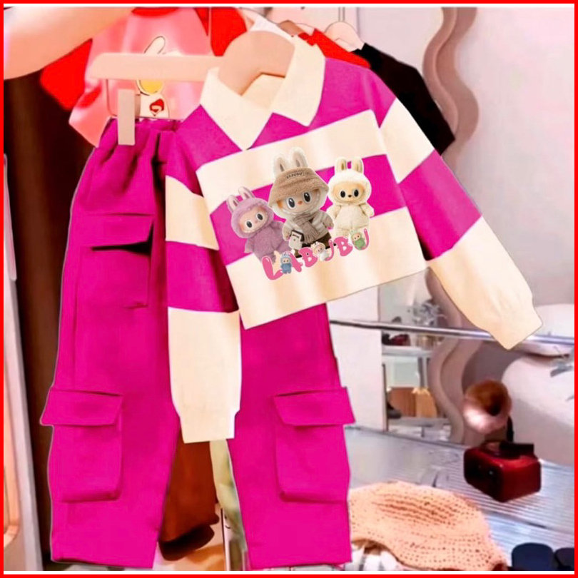 Setelan Labubu Sweater One Set Cargo Anak Perempuan Baju Dan Celana Panjang Model Labubu Cargo Usia 1-12 Tahun