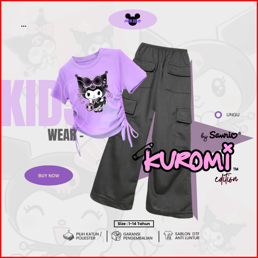 Setelan Kaos Serut Crop Top Dan Celana Kargo Anak Perempuan Kekinian Kuromi Cinnamorol Sanrio