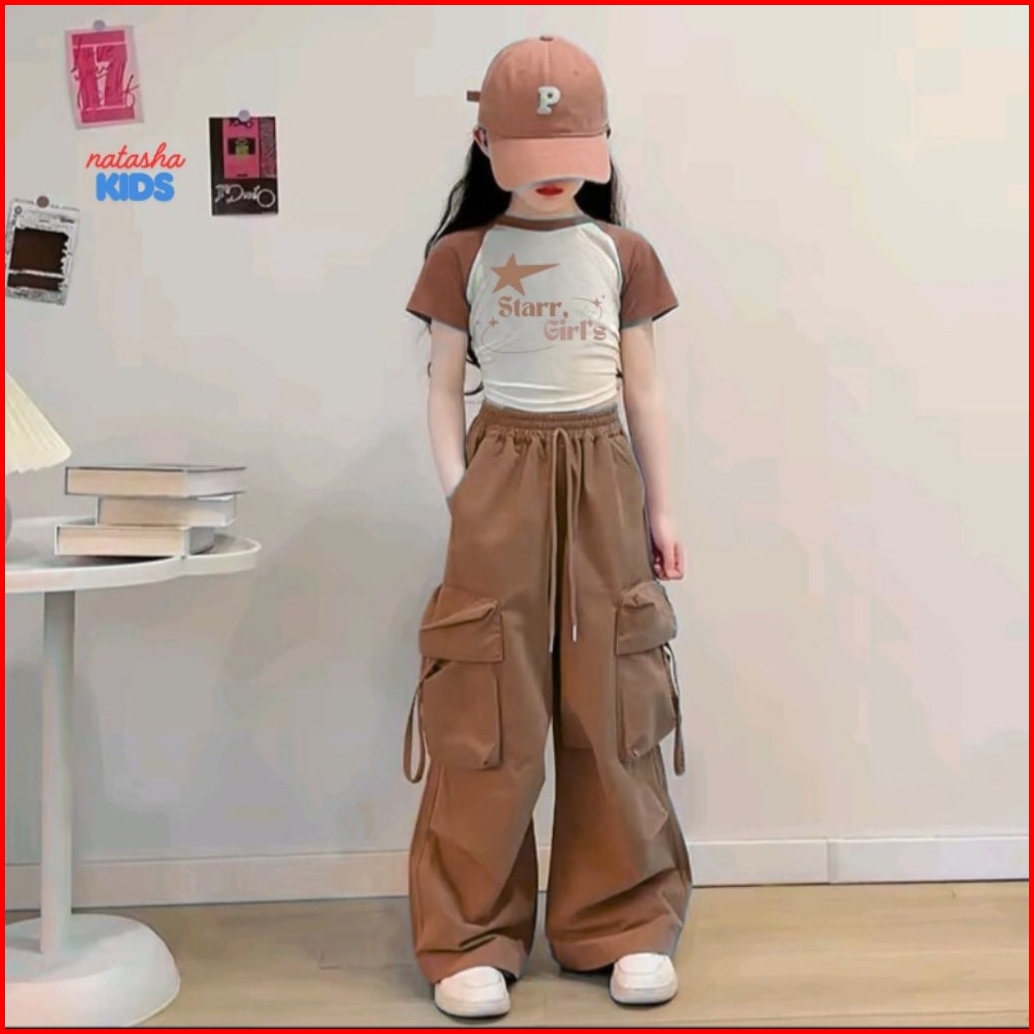 Setelan Baju Anak Perempuan Katun Combad 30s Cargo Raglan Crop Star Girls 1-12 Tahun
