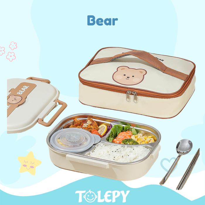 Stainless Steel Lunch Box / Tempat Makan Anak / Kotak dan Tas Bekal - 4 Sekat - Bear