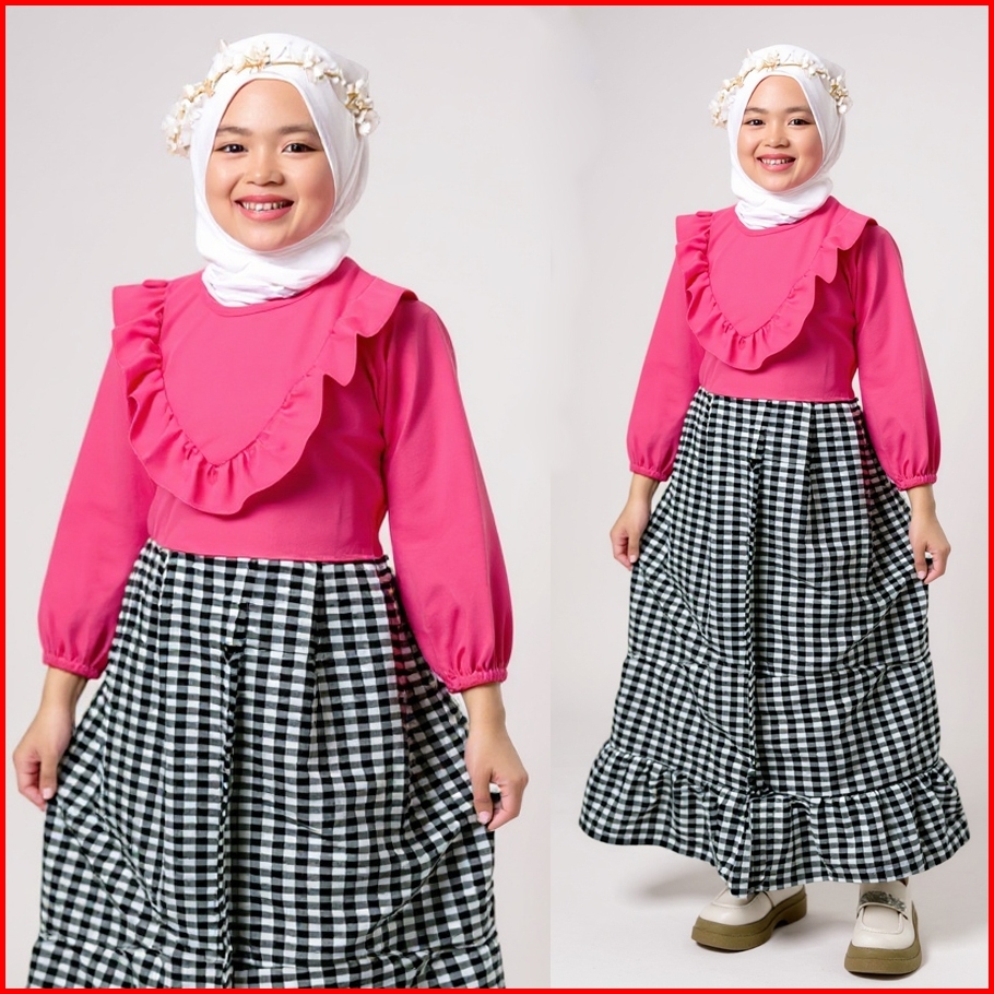 Gamis Anak Kombinasi Kotak Dress Riyanti Kancing Syari 2-13 Tahun Kids Carlina Fashion