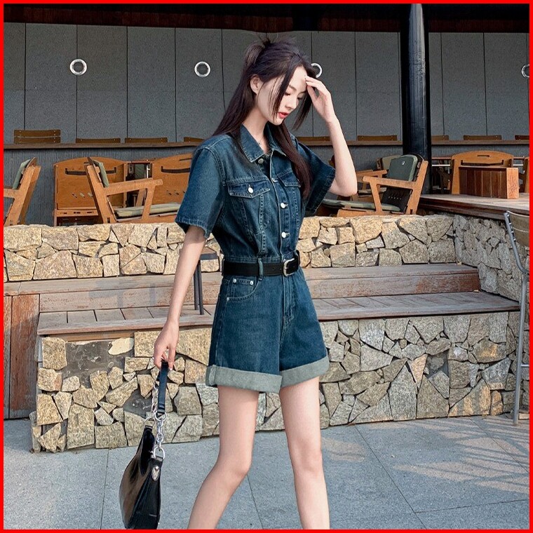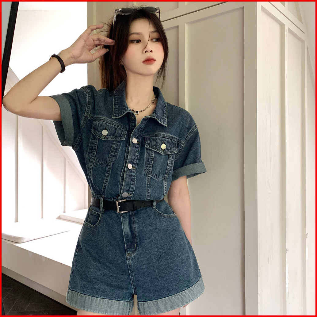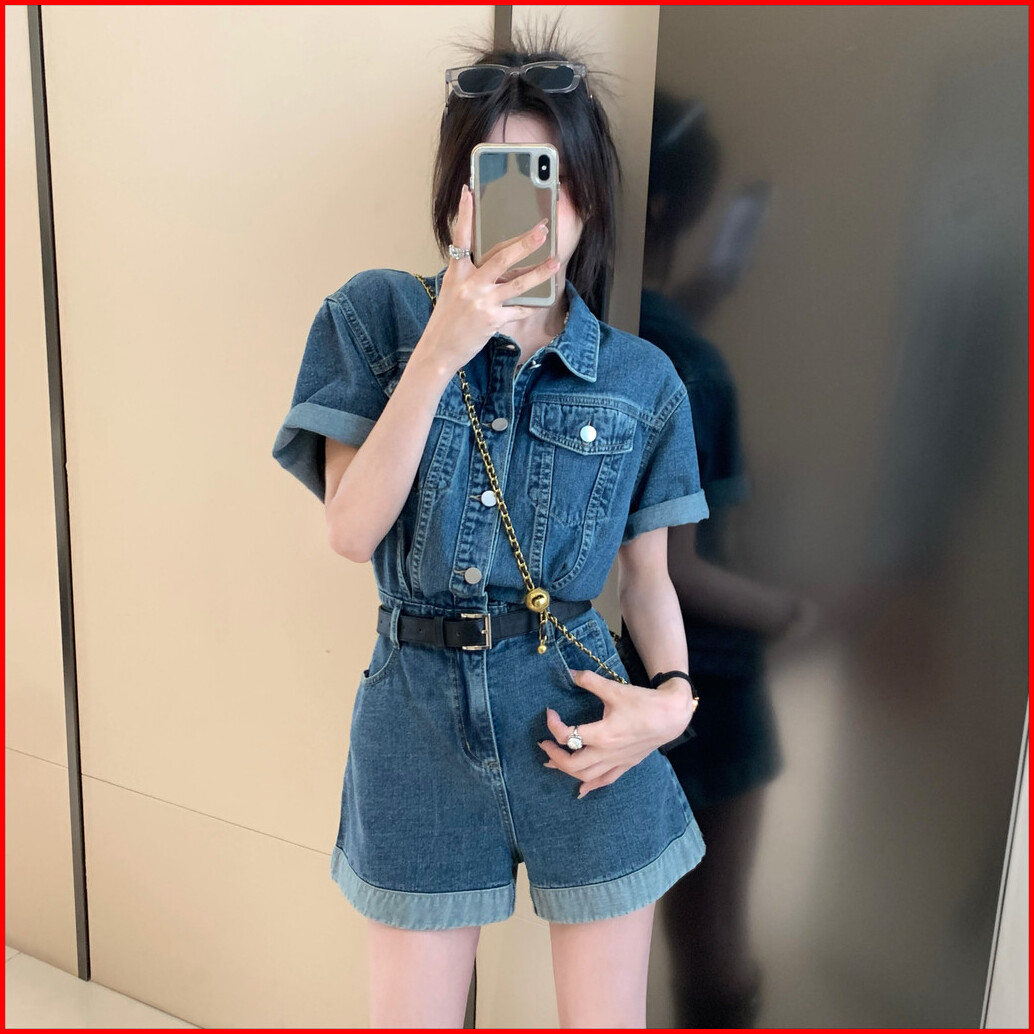 Jumpsuit Pendek Denim Retro Dengan Lengan Pendek Pinggang Lebar Dan Kaki Celana Pendek Baru Tidak Termasuk Ikat Pinggang