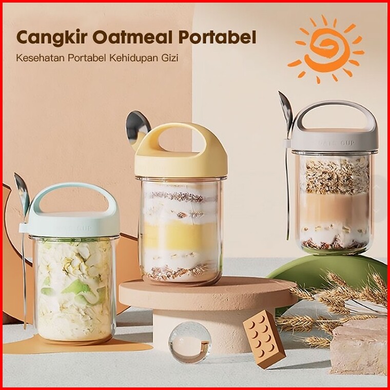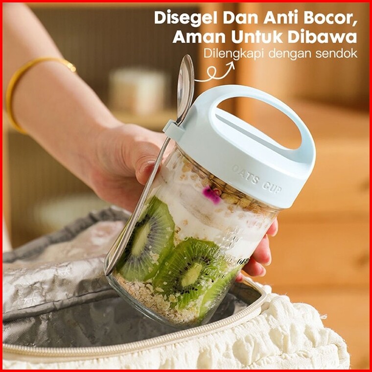 Eatkit Gelas Kaca Oatmeal 350ml Dengan Tutup Anti Tumpah Free Sendok Stainless Glass Cup Mug Salad