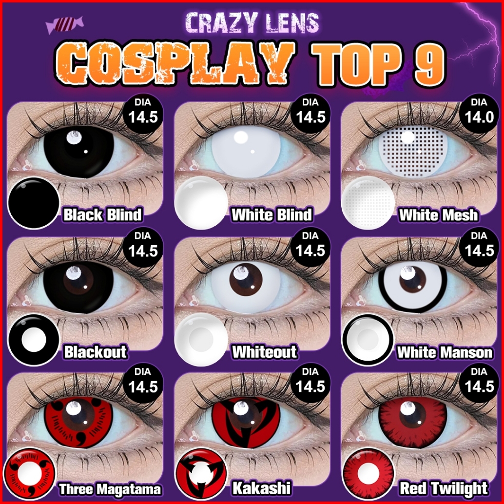 Whiteout(visible), Blackout(visible), White(blind film), Black(blind film), Sasuke 3 Tomoe MY18, kakashi MY16, Vampire Red MY26, Solid Red MY04, White Manson MY22, White Mesh MY11, White Cat Eye MY08, mata kucing kuning, Sasuke MY17, merah muda cerah, Vampire Gray MY29, White spider webMY13, Red Crack MY14, Red Manson MY20, Bloody Fangs-MY53, Vampire Yellow MY25, Vampire Green MY27, Vampire Purple MY28, White Crack MY35, Green Lizard EyeMY37, Nine Tails KuramaEye, Naruto Sage ModeMY51, TripleTomoeSharingan, Yellow-MY39, Green-MY07, Yellow-MY05, blue-MY02, blue-L233, Violet-L231