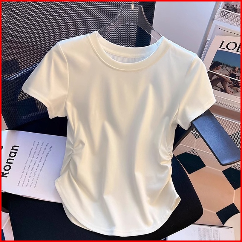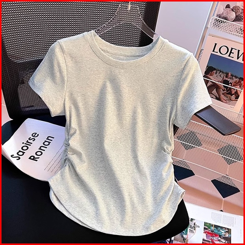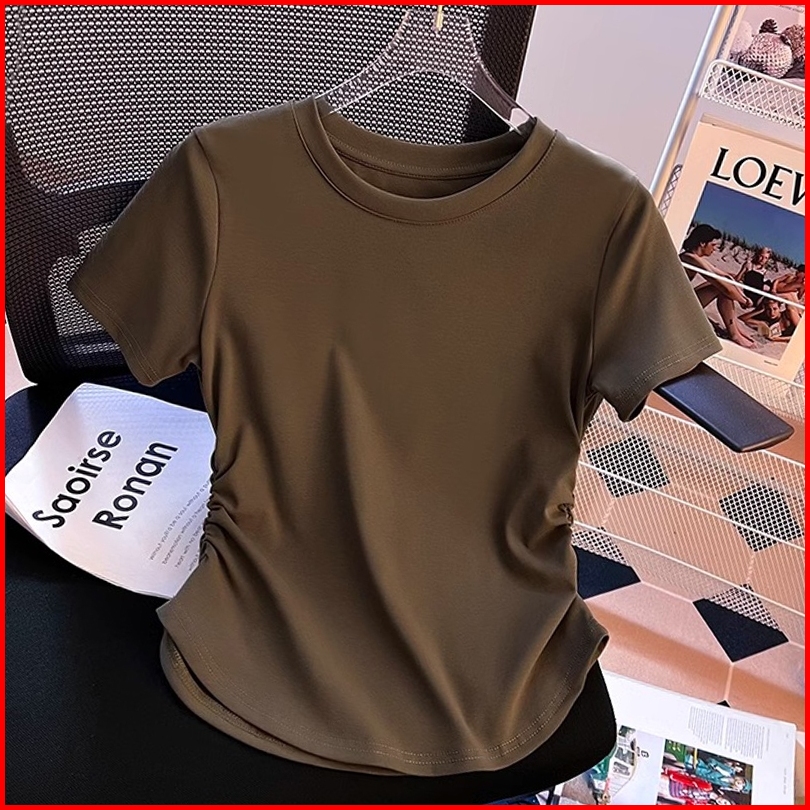 T-shirt Leher Bulat Bergaris Coklat Retro T-shirt Ketat Melar Fashion Korea Atasan Wanita Modern