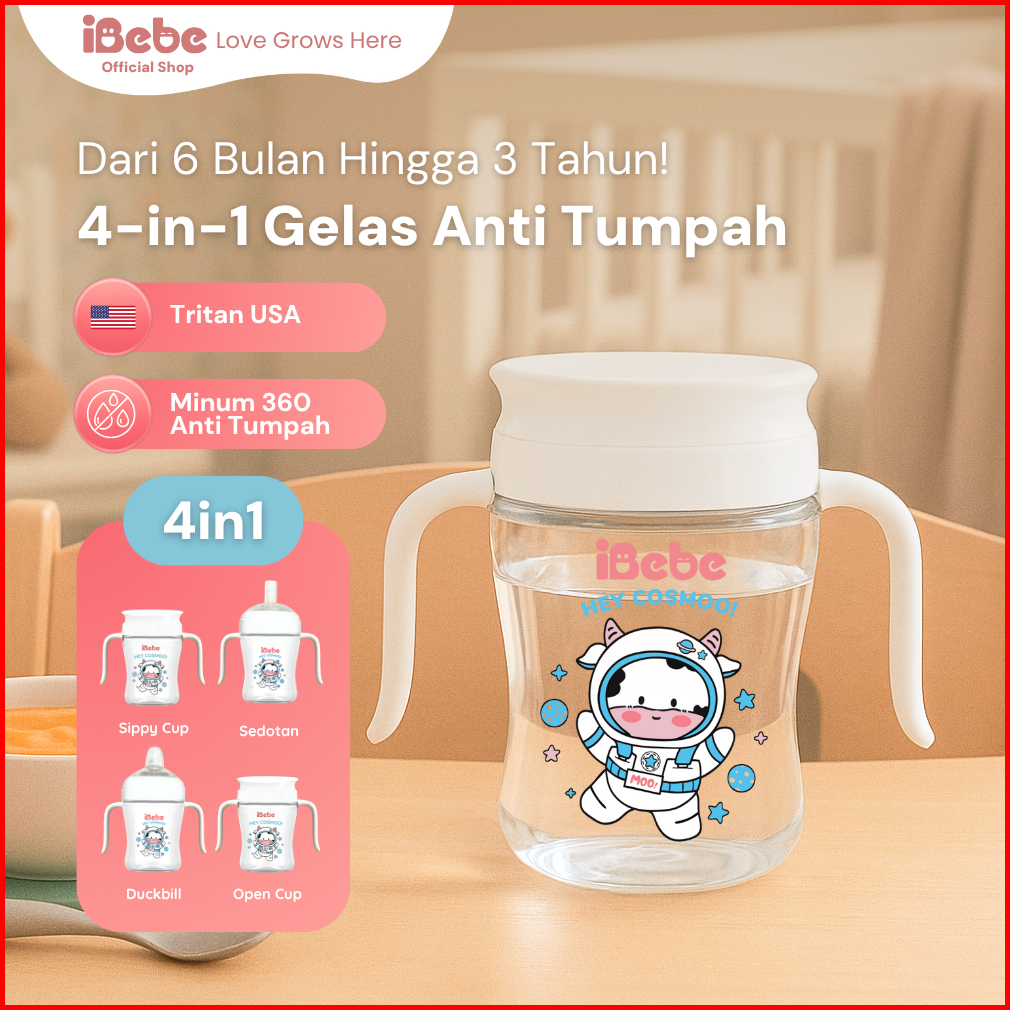 Ibebe 3in1 Gelas Minum Sedotan Moomoo Anak 210ml Tritan Anti Tumpah With Handle Sippy Cup Anak Bayi 6 Bulan