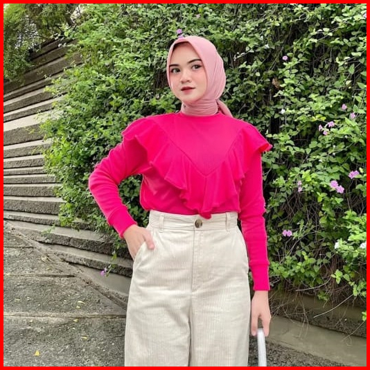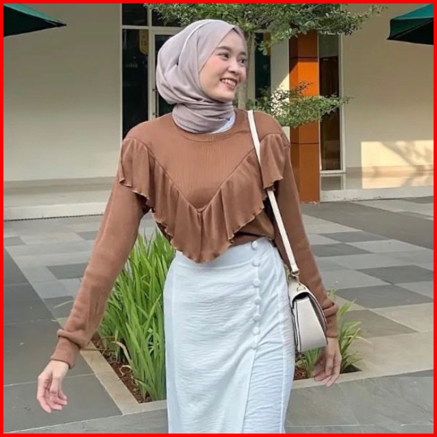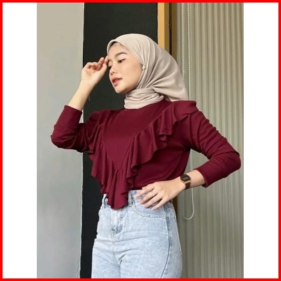 Kaos Lengan Panjang Rumbai Knit Ruffle Top Cotton Rib