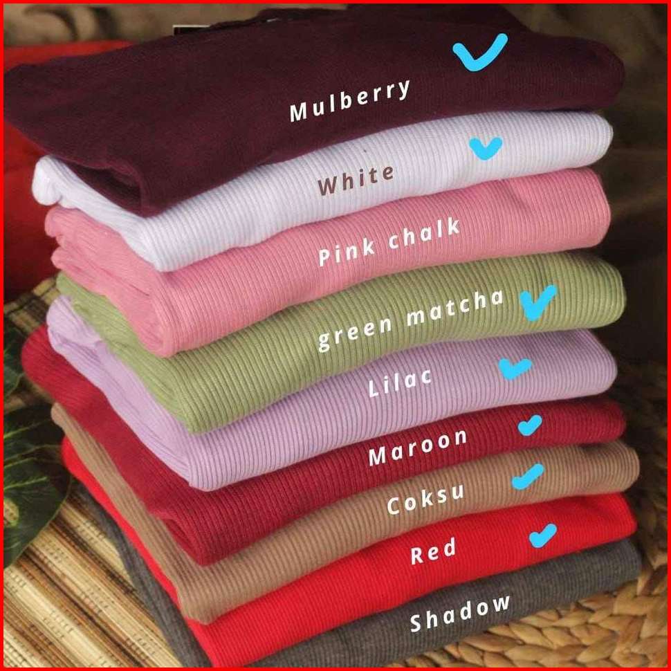 Navy blue, Dusty Pink, Bata, Mustard, Mint / Green Pastel, Marun, Lilac, Coksu, Hitam, Putih, Biru, Hijau Army, Taro, Krem, Abu misty, Abu Tua, Brown metal, Cokelat Tua, Hijau botol, Kuning DJ, Merah Candy, Mouve, Rasa mint, Salem, Tosca, Violet, Fuchsia, Lime