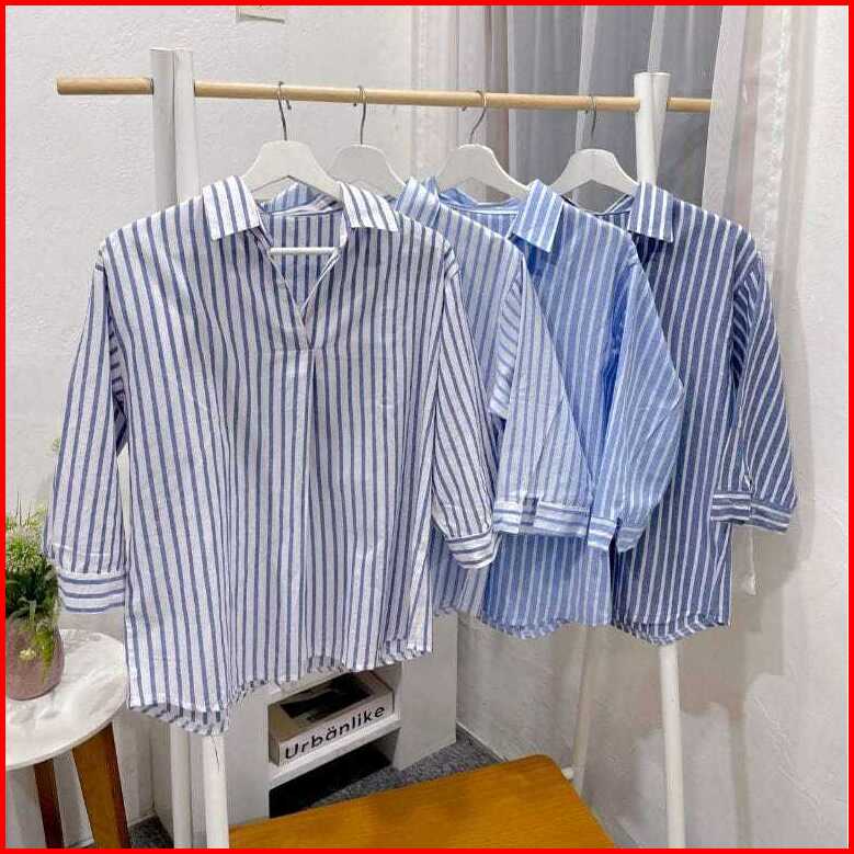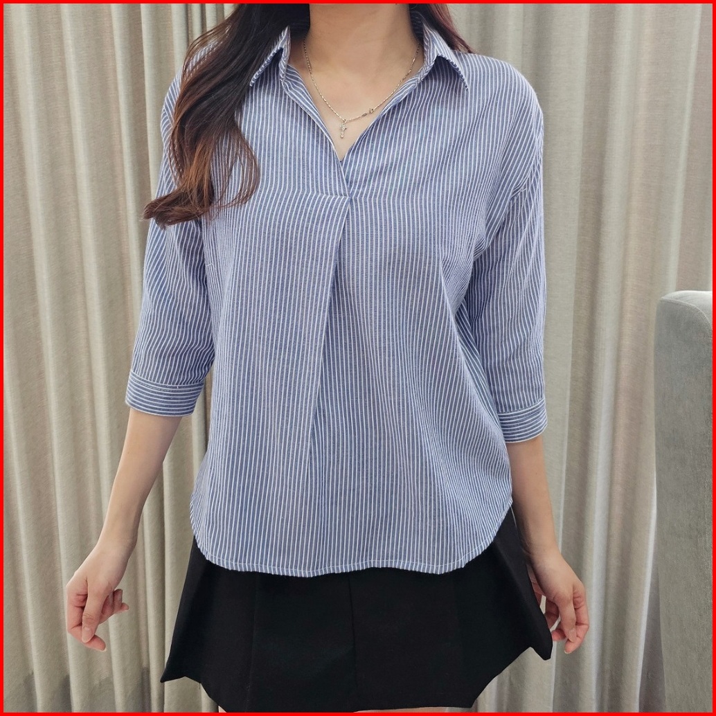 Dinafshn - Velisa Kemeja Blouse Wanita Strip Salur Vneck Cotton Premium