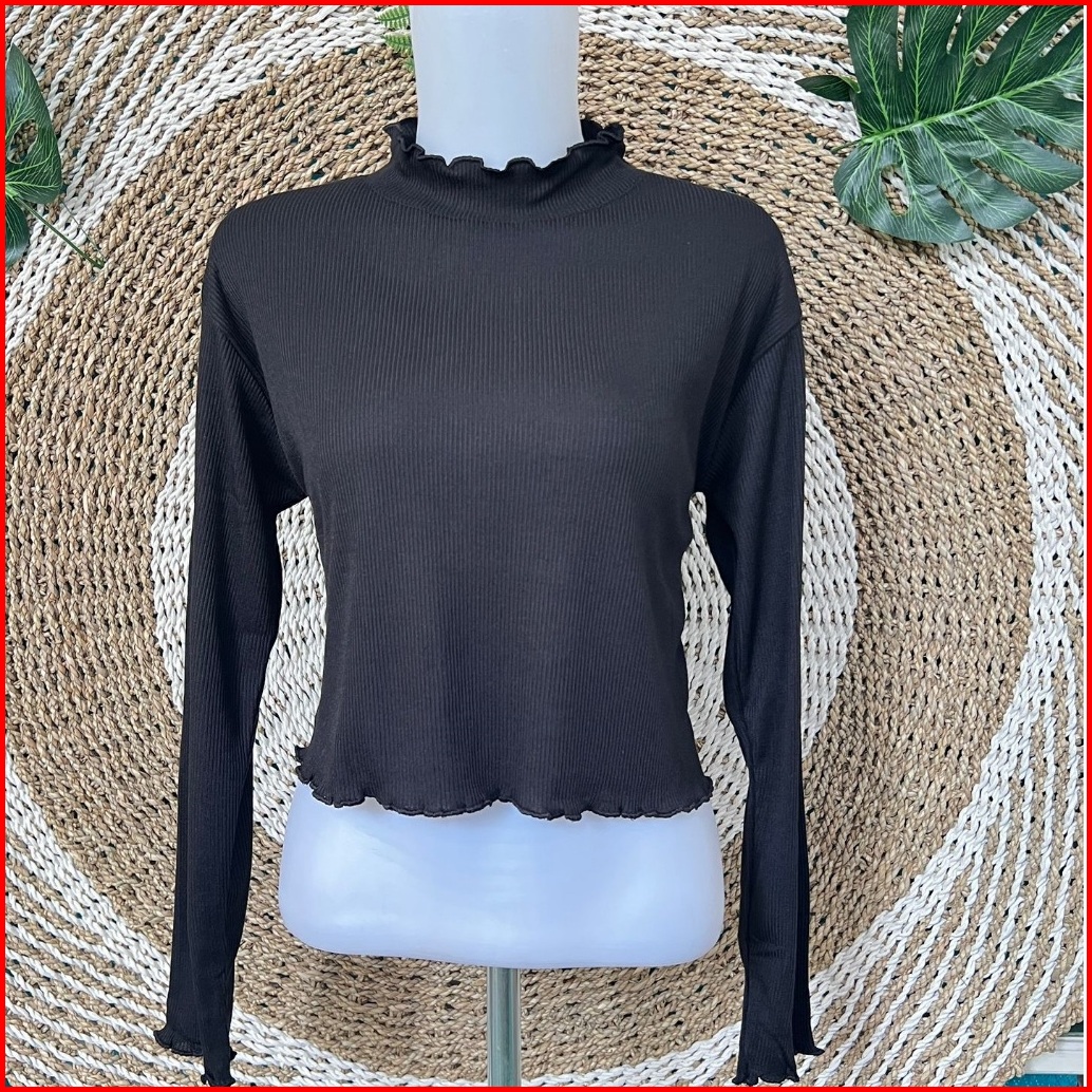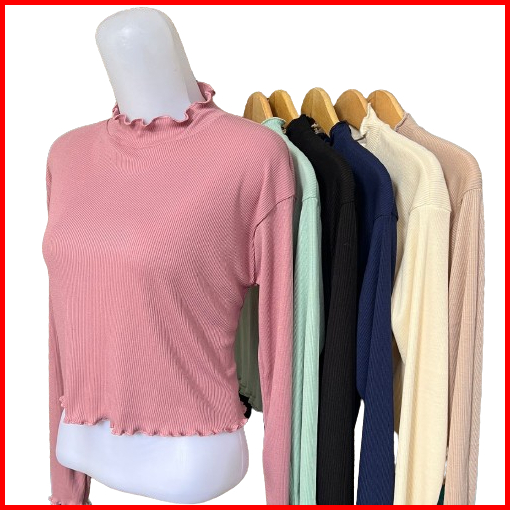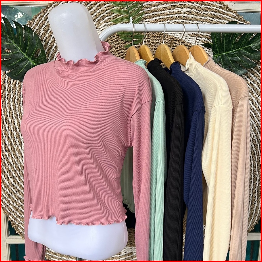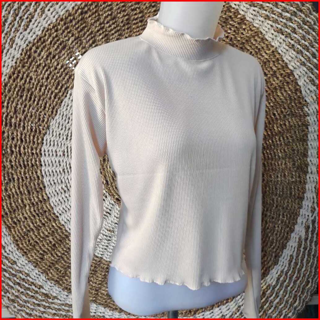 Crop Top Atasan Rajut Rib Kriwil Lengan Panjang Neck Long Sleeve Shirt Blouse