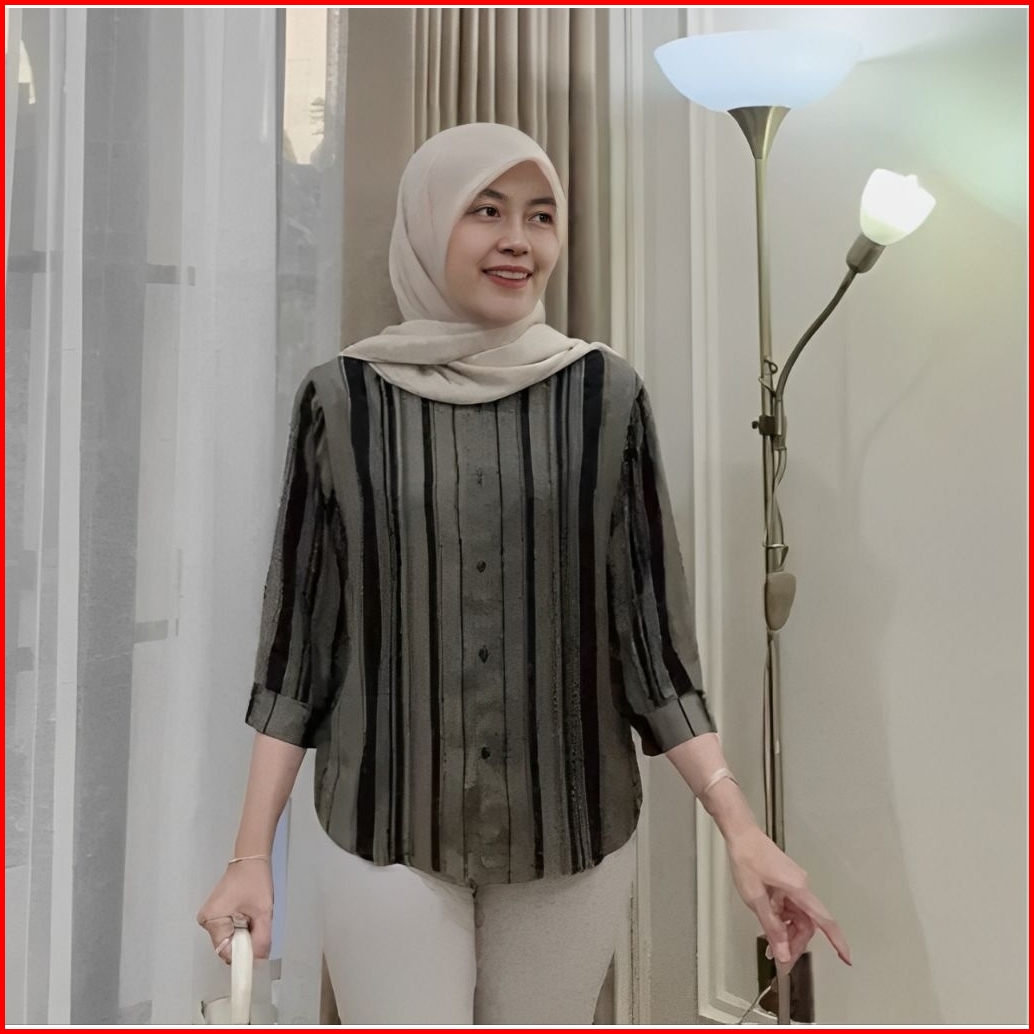 Kemeja Rayon Wanita Motif Oversize Daily Salur Rayon Jumbo Lengan 7 8 Kualitas Baik