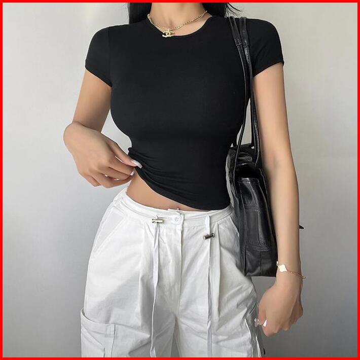 Premium Kaos Wanita Dasar Warna Solid Elastis Lengan Pendek Leher Bulat