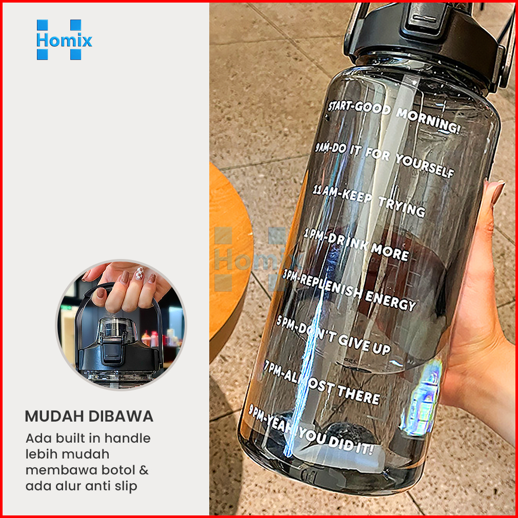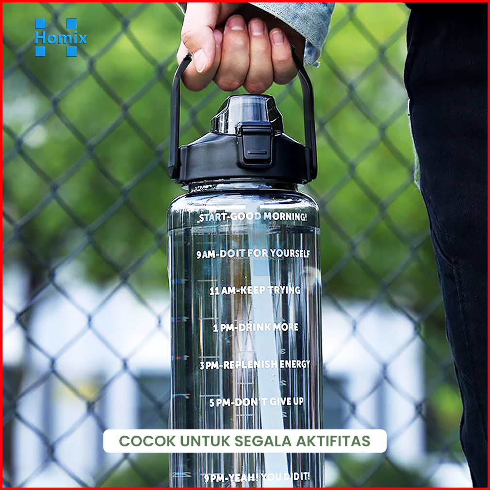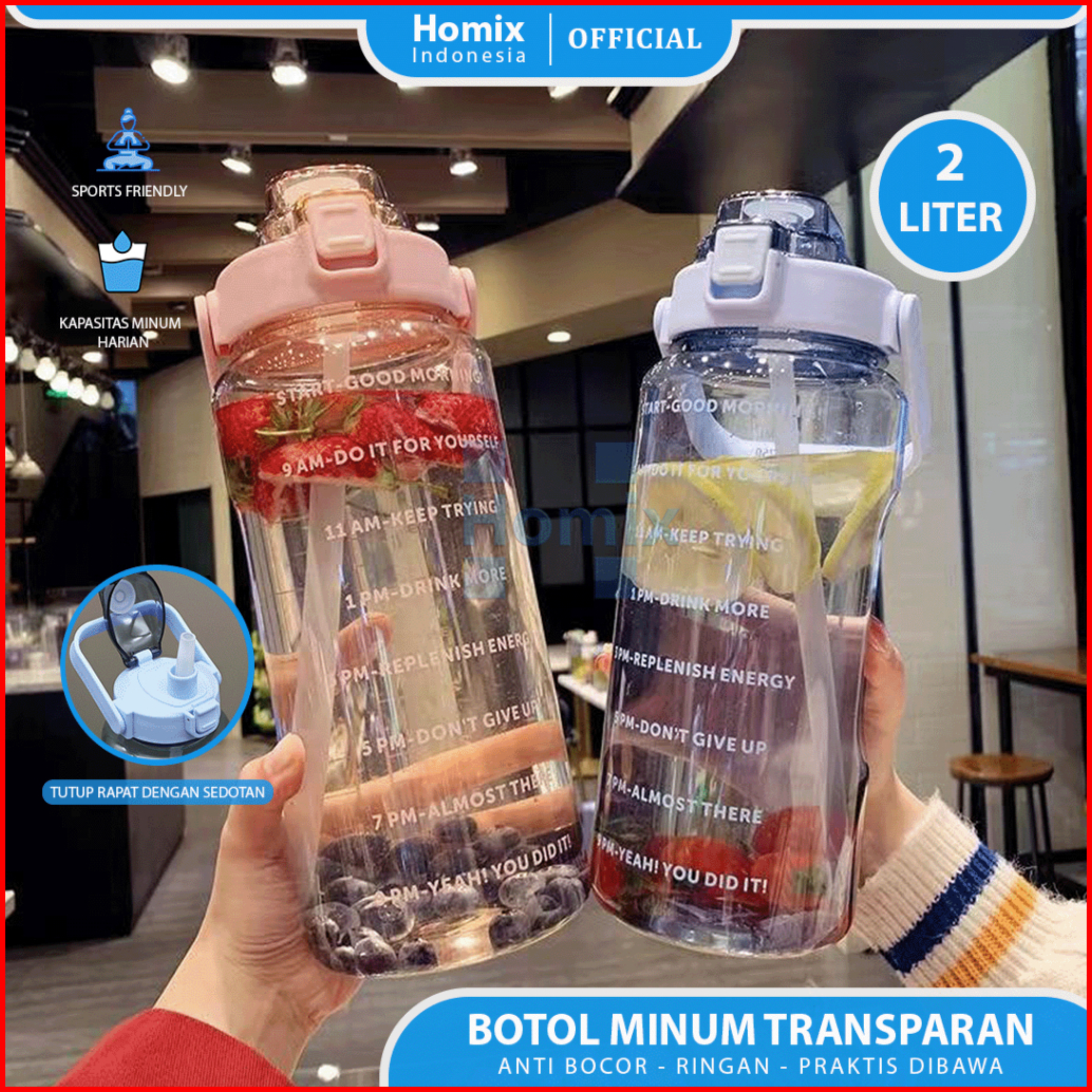 Homix - Botol Minum Jumbo 2 Liter Transparan Dengan Sedotan Penanda Waktu