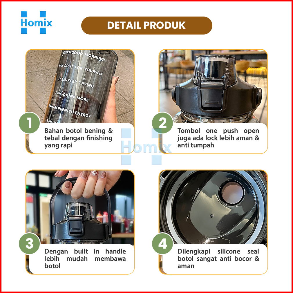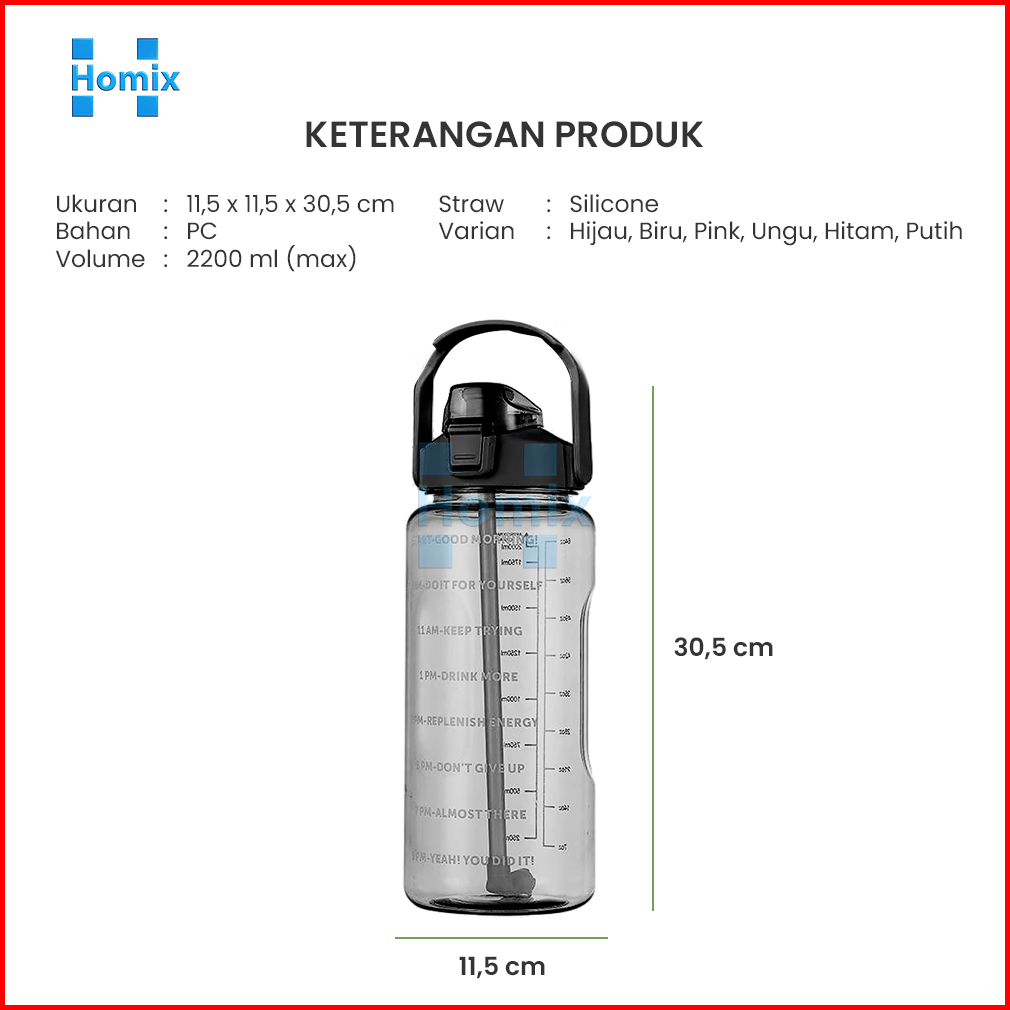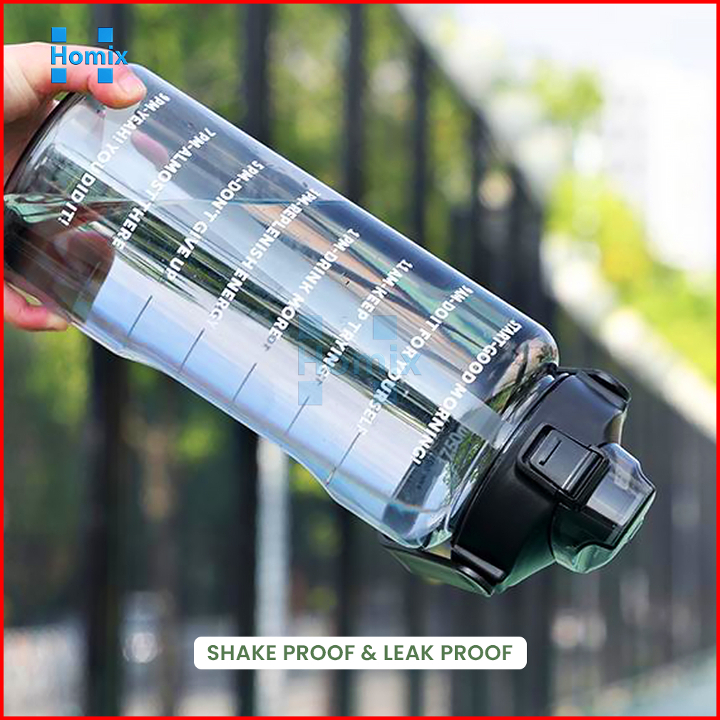 Homix - Botol Minum Jumbo 2 Liter Transparan Dengan Sedotan Penanda Waktu