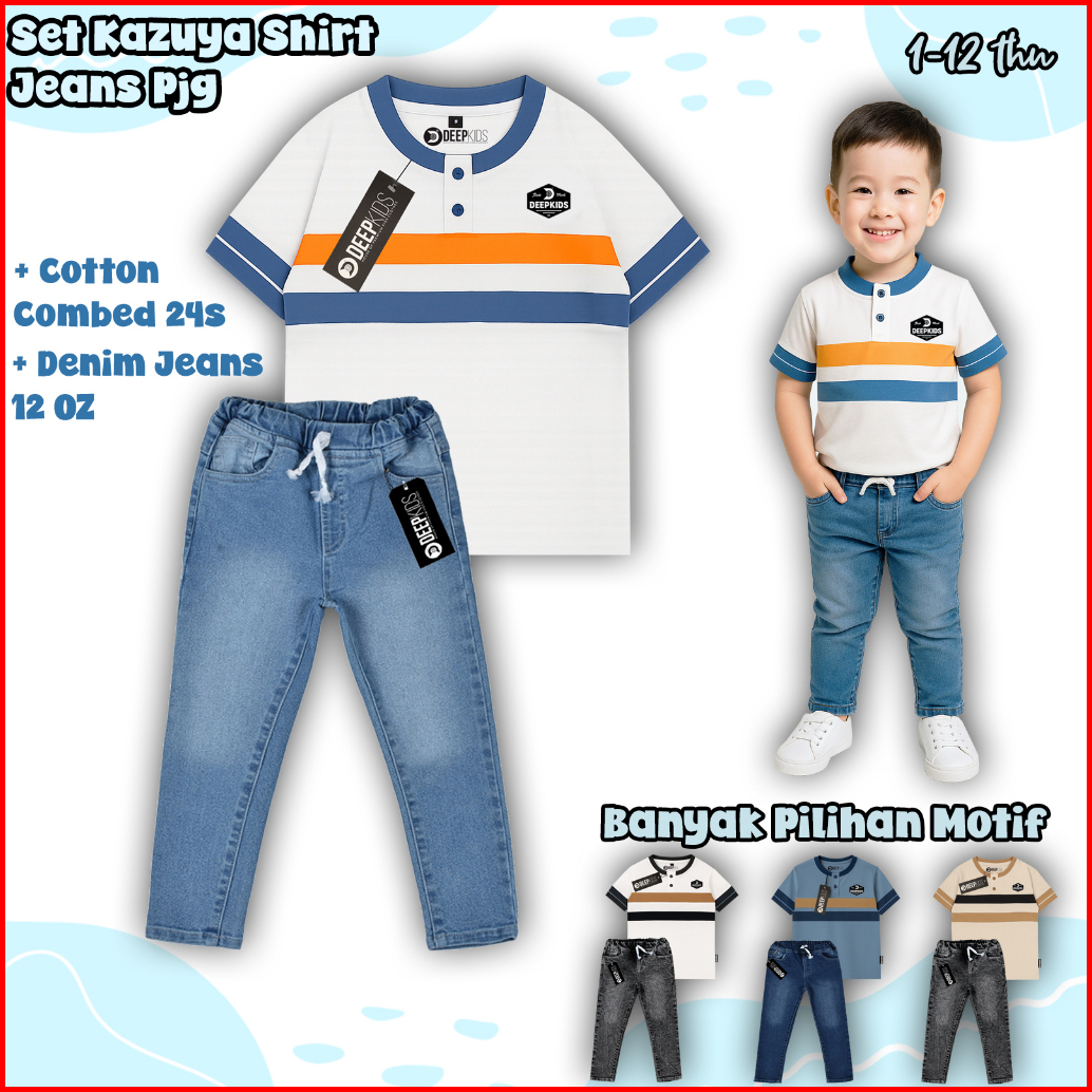 Deepkids Setelan Anak Laki Laki Kaos Kerah Kancing Celana Jeans Panjang Bahan Cotton Combed 24s Denim Jeans Tebal Usia 1