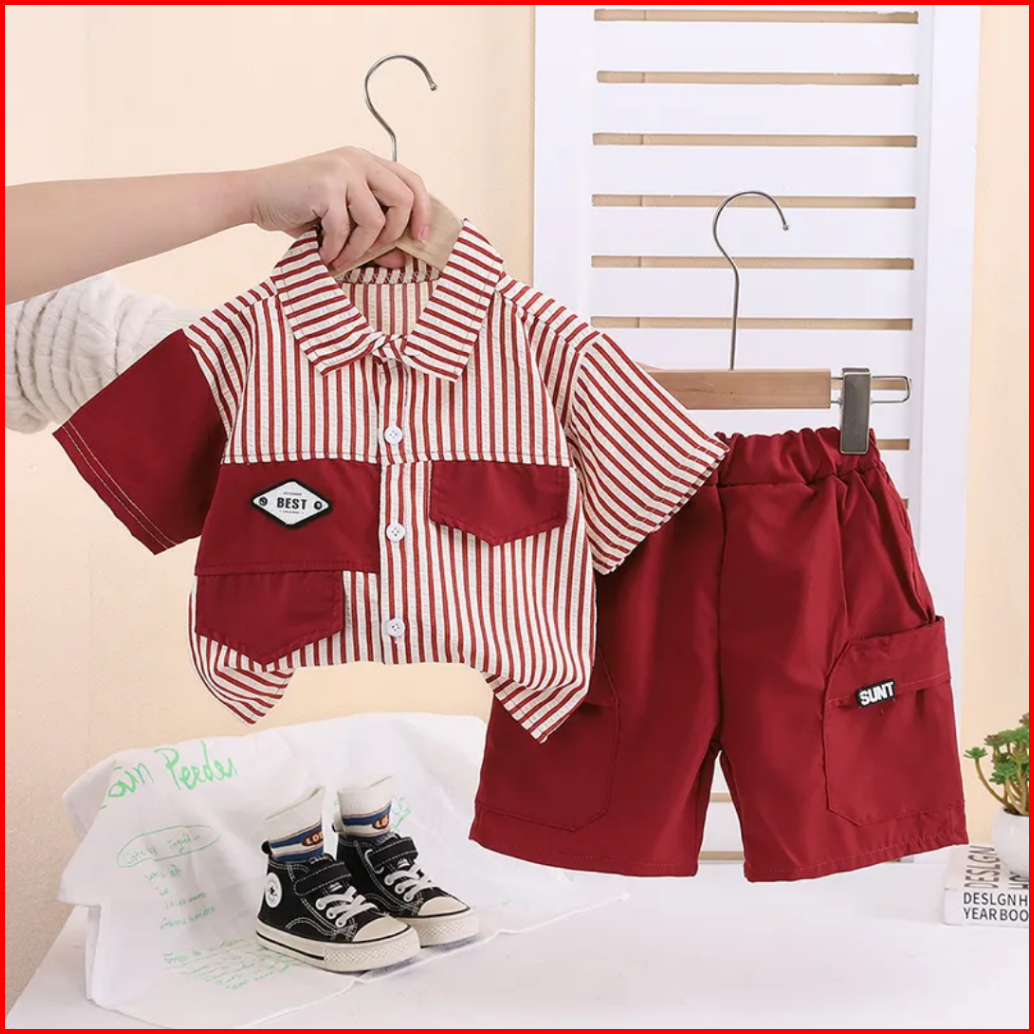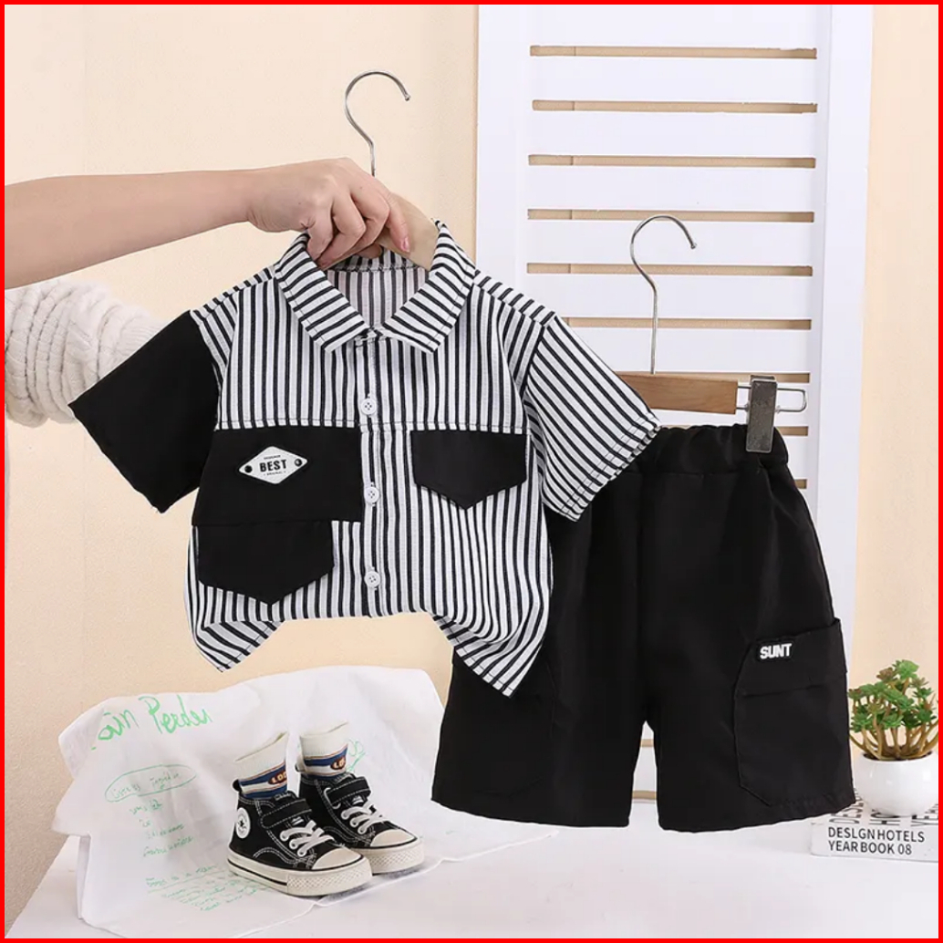 Setelan Kemeja Kombinasi Anak Laki Laki Celana Pendek Cargo 1-6 Tahun
