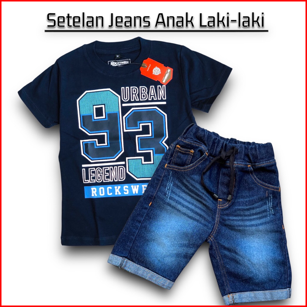 Setelan Baju Kaos Anak Dan Celana Pendek Jeans Usia 4-15 Tahun
