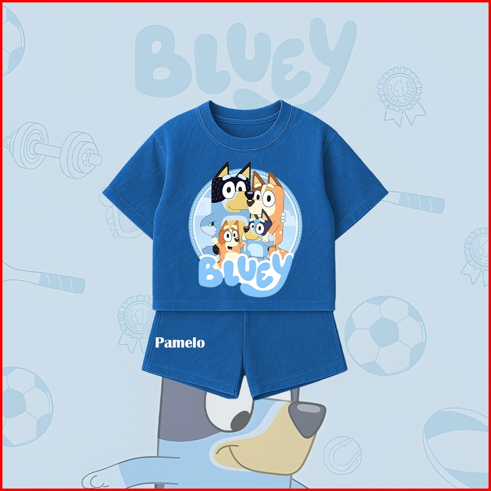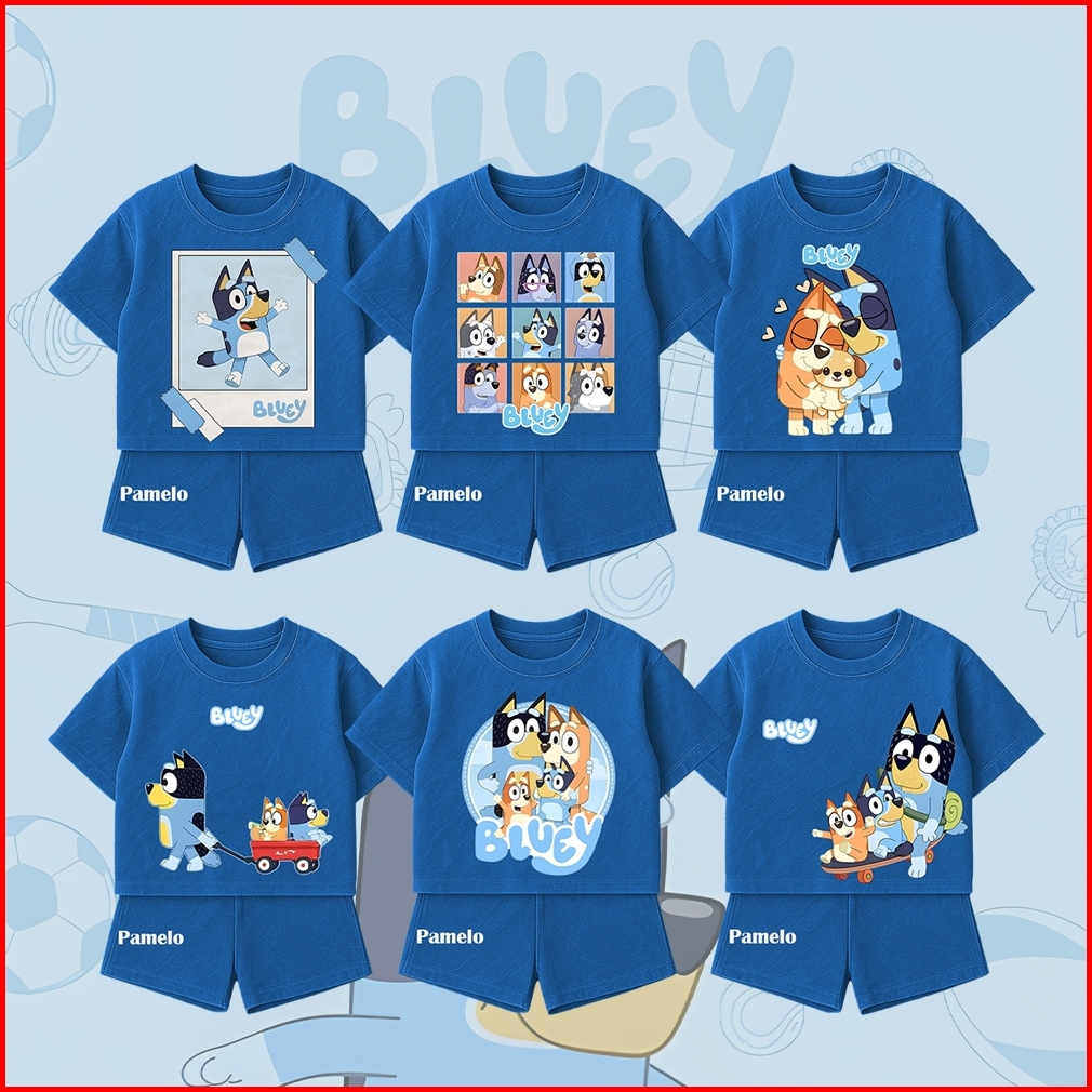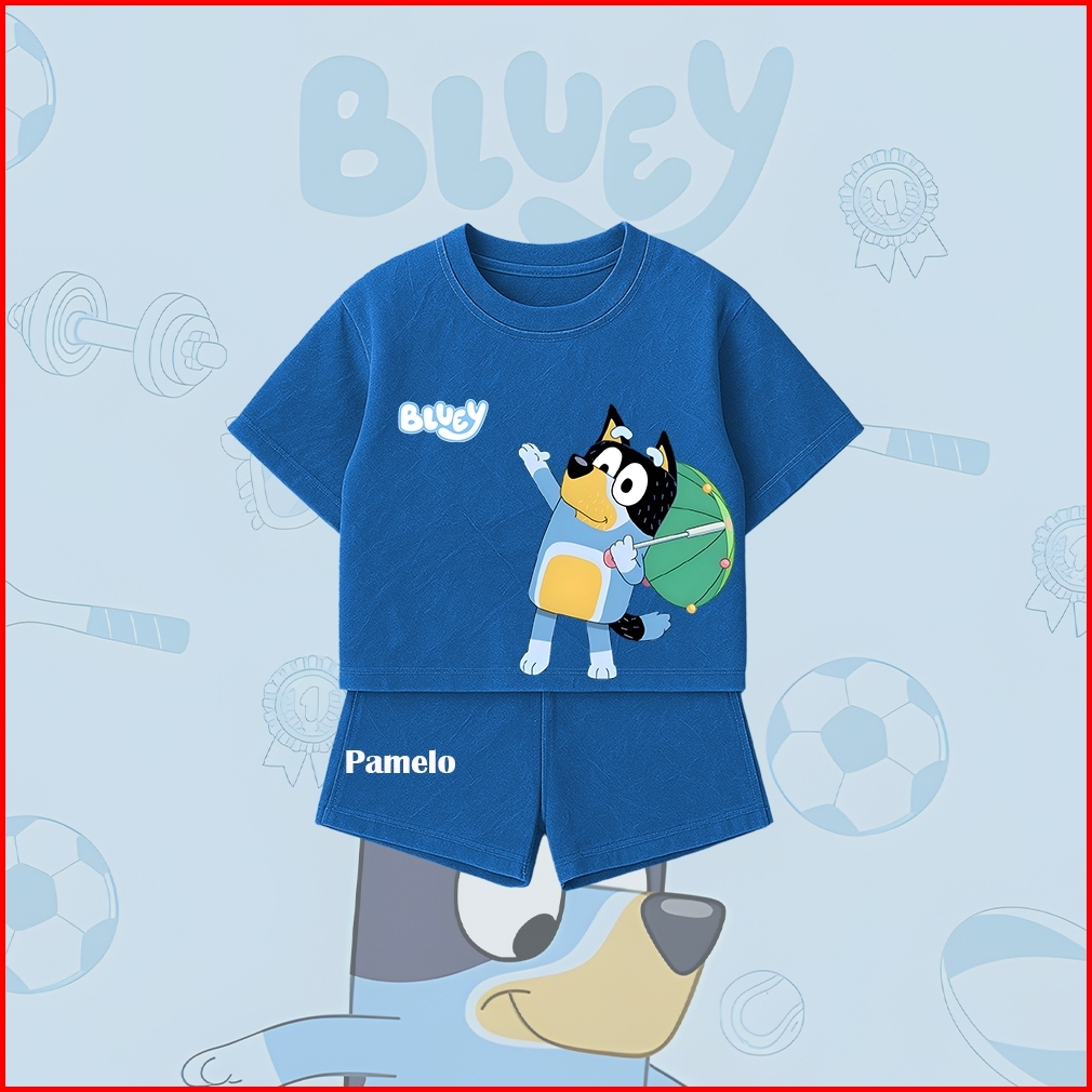 Pamelo.id Setelan Denim Anak Bluey Baju Kaos Pendek Celana Santai Lucu Adem Anak Perempuan Laki Laki