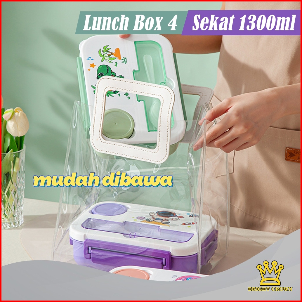 Bright Crown Kotak Makan Wadah Bekal Karakter 4 Sekat 1300ml Lunch Box Anti Tumpah Free Sendok Garpu