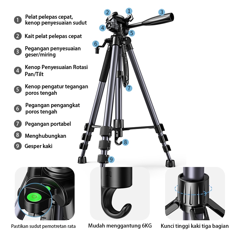 Akona 1.7M Tripod Kamera Handphone Bluetooth Remote Konten Kreator 360° Rotasi Tripod HP Anti Goyang 1/4 Adaptor Free Ta