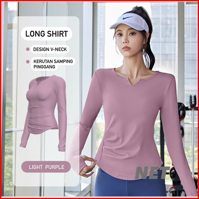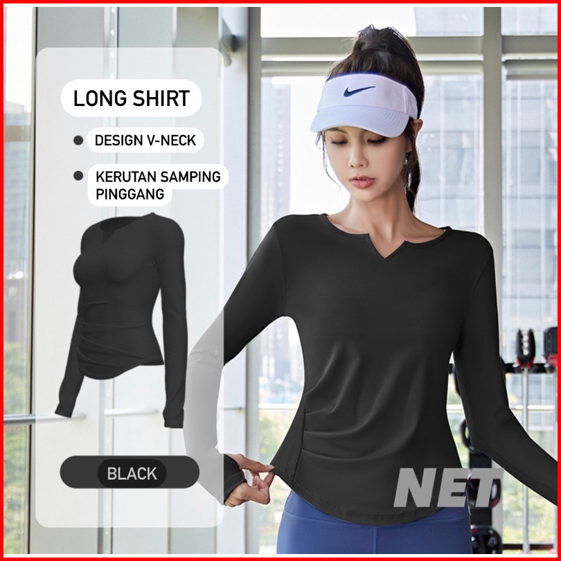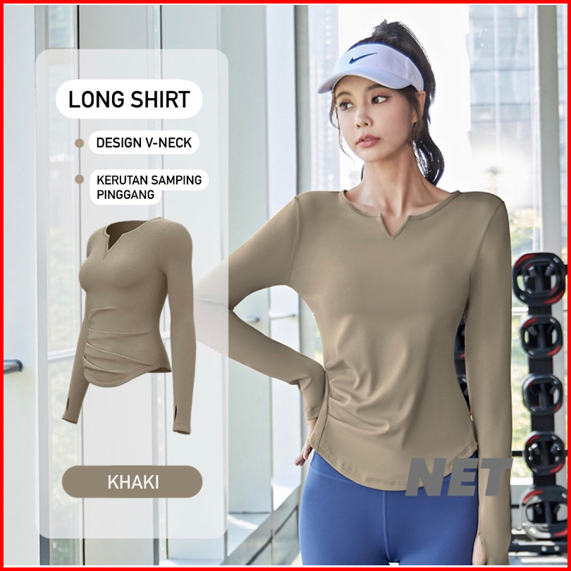 Baju Kaos Olahraga Wanita Lengan Panjang V Neck Yoga Gym Fitness Slimfit Berkerut Di Samping Pinggang